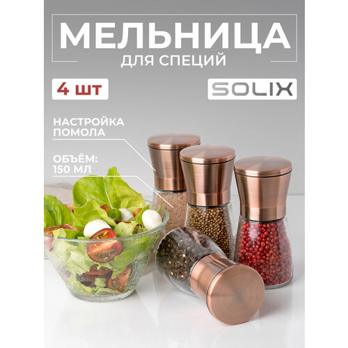 Ручная мельница для перца, соли и специй с крышкой SOLIX, 150мл, стекло, керамика, медь, металл, 4 шт.: сравнение цен, характеристики, фото, актуальное наличие и цены.