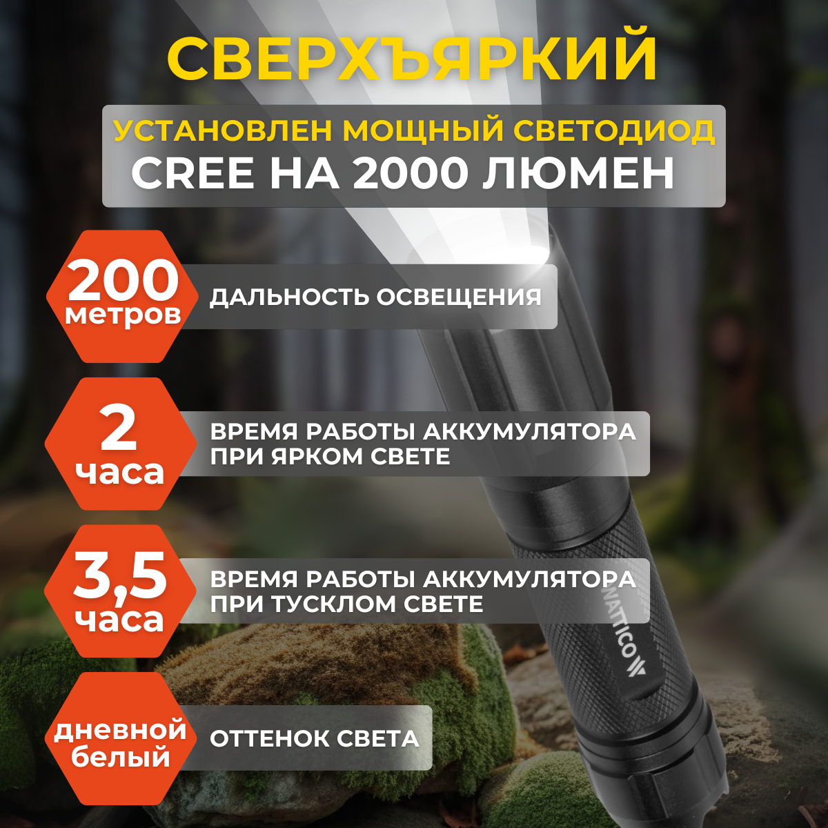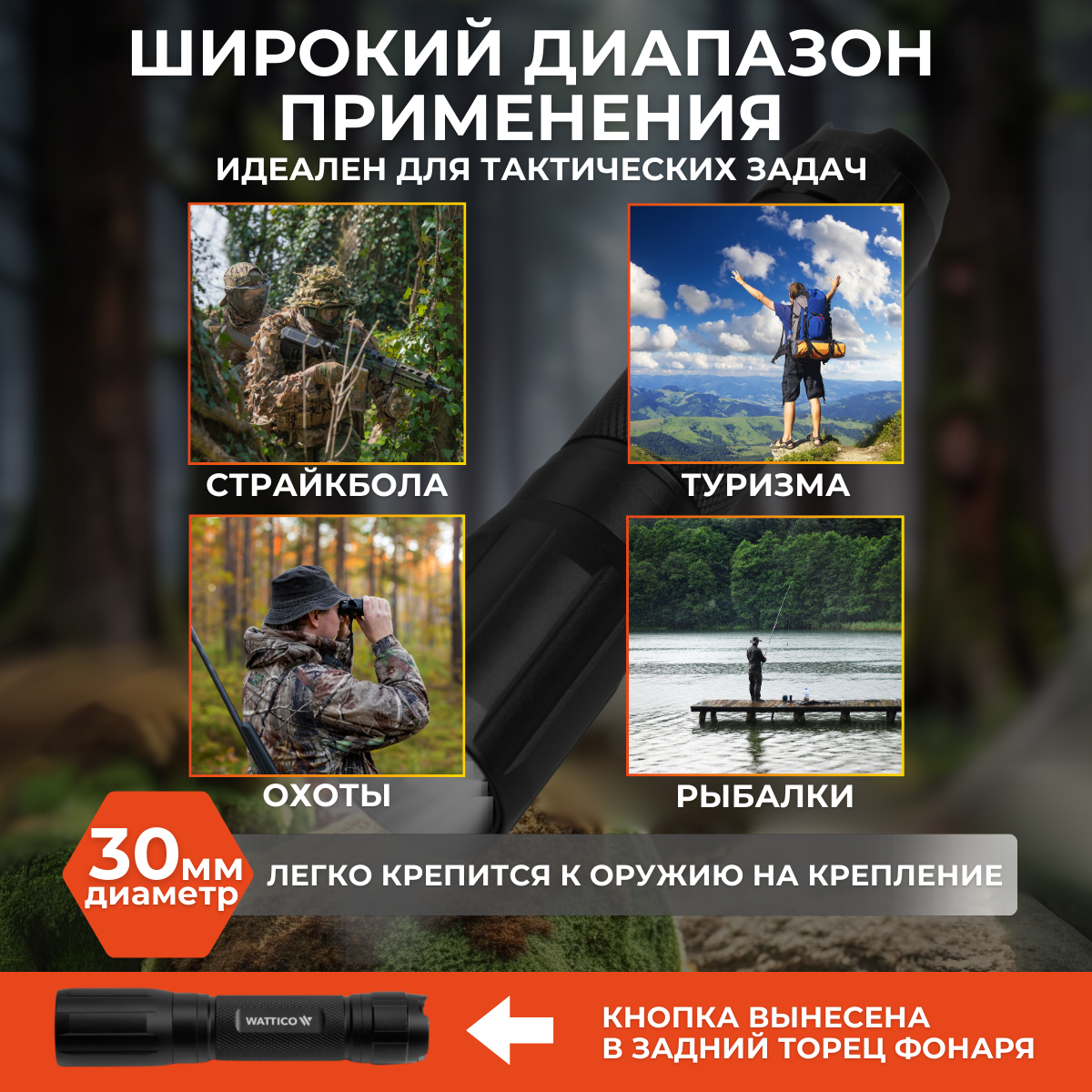 Купить Ручной фонарь тактический аккумуляторный 2000 люмен Wattico Supernova подствольный на оружие с зумом, подарок охотнику на 23 февраля с доставкой по всей России.
