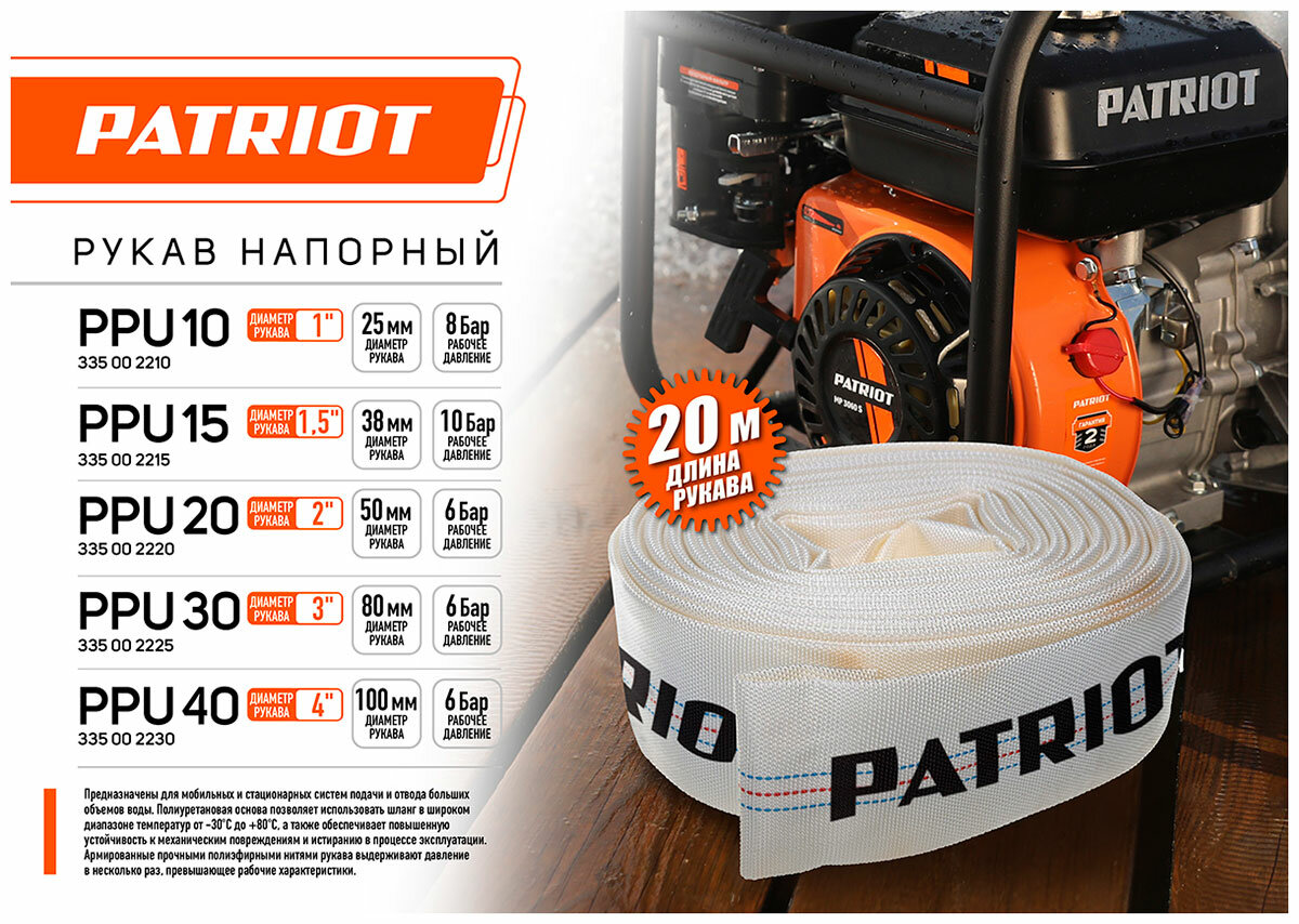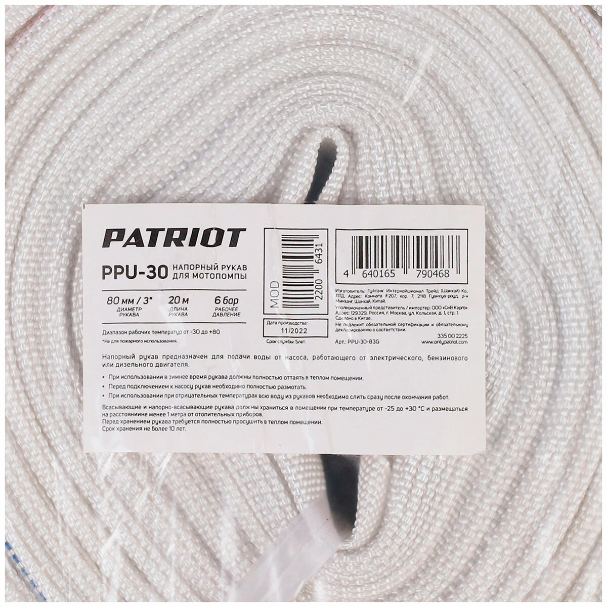 Рукав напорный Patriot PPU-30, длина 20 м, 75 мм — 3 дюйма (335002225): сравнение цен, характеристики, фото, актуальное наличие и цены.