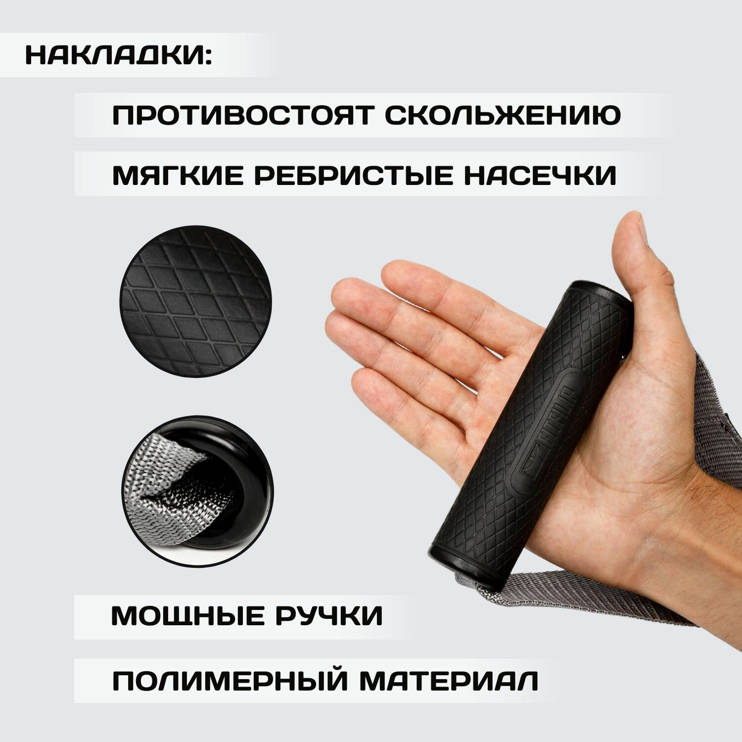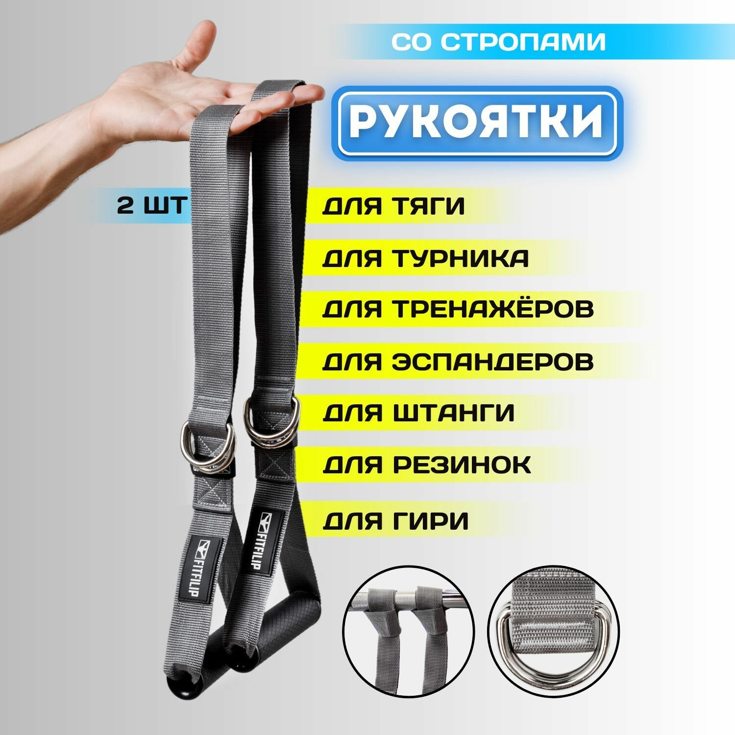 Рукоятки FITFILIP с кольцами и со стропой. Многофункциональные ручки с полукольцами и лентой, предназначены для использования в тренировках с различным спортивным оборудованием: атлетическими тренажерами, штангами, гирями, блинами от грифа, эластичными эспандерами и фитнес резинками, на спортивных дворовых комплексах, турниках и брусьях. Рукоятки позволяют соединяться с оборудованием несколькими разными способами, в этом их преимущество и отличие от других моделей. Рукоятки FITFILIP состоят из трёх основных частей: строп длиной 50 см, удобная трубчатая ручка, пара крепёжных колец. Рабочая часть - ручка из крепкого полимерного пластика с комфортной фактурной резиновой поверхностью и фирменным логотипом. Защищают ладони от дискомфорта и натирания, скольжения, помогая сосредоточиться на упражнении. Размеры ручки рассчитаны таким образом, чтобы её было комфортно удерживать широкому кругу пользователей. Сквозь ручку продет и зашит в кольцо строп из прочной синтетической ленты. Конец ленты свободный. Общая длина рукоятки - 50 см. В непосредственной близости к ручке на границе ленты вшита пара стальных полуколец, которые изготовлены из стального прута толщиной 6 мм. Прут сварен на стыке, покрыт хромом и лаком. Подобная обработка надёжно защищает от коррозии и повреждений. Имея два металлических кольца и длинный свободный конец ленты (стропа), рукоятка может соединяться со спортивным инвентарём через кольца или с помощью ленты на выбор. Ширина стропа 3,8 см, общая длина 50 см, диаметр ручки 3,5 см, длина ручки 13 см, вес набора из двух штук 410 гр. В комплект 2 рукояти и каждый покупатель получает фирменную сумочку в подарок. Давайте немного разберёмся как их использовать. Рукоятки FITFILIP с кольцами и лентой универсальны, они вращаются по заданному направлению движения, руки разворачиваются на нужный угол. Максимальная грузоподъемность 300 кг. Возможны следующие варианты соединения со спортивным оборудованием. Вариант No1 с помощью колец. Металлические полукольца способны обеспечить быстрое и качественное соединение любого инвентаря, имеющего карабин. Это может быть подвесные ремни, борцовский жгут, трубчатый эспандер, резиновые петли, латексные ленты или трос спортивного тренажера (блочный, рамка и т. д.). Через дополнительный карабин можно быстро пристегнуть фитнес резинку, строп или другой удлинитель. Модель предусмотрительно оборудована двумя полукольцами, что позволяет увеличивать количество присоединяемых элементов. Резинки и канаты можно цеплять к кольцам без карабинов способом «на удавку». Вариант No2 с помощью ленты. Свободная лента может быть самостоятельным средством соединения. Ленту можно привязать к грифу, перекладине, рукоятке штанги, гире, ветвь дерева, шведская стенка. Для свободного зацепления петлей ленту продевают через оборудование и фиксируют. При отсутствии необходимости использования ленты или фиксации свободного конца ленты следует воспользоваться вшитой застёжкой из полоски синтетической ткани и «липучкой». Рукоятку можно крепить за один конец фитнес резинки или resistance bands, а противоположный край можно зафиксировать посредством дверного якорного крепления, приобрести фиксатор для двери можно в нашем магазине, этот спортивный аксессуар отличный помощник для домашних тренировок. Идеально подходят для профес