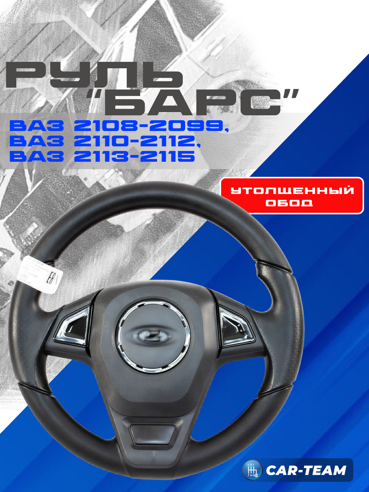 Руль ВАЗ 2114, 2110, 2111, 2112, 2108, 2113, 2115 спортивный, тюнинг трехспицевый черный руль "Барс" со вставками черный лак, эмблема ладья с утолщенным ободом - стильный и функциональный руль придаст вашему автомобилю неповторимый вид и обновит интерьер.