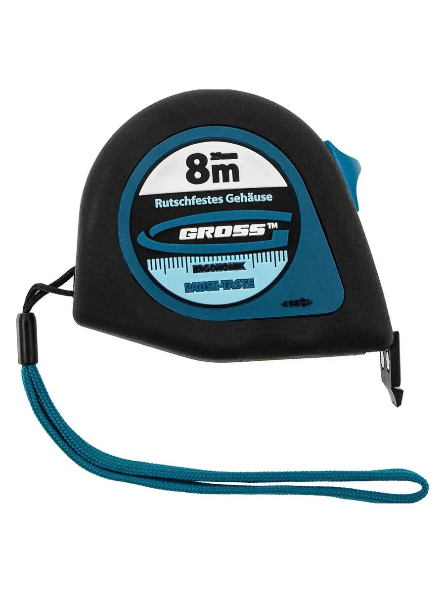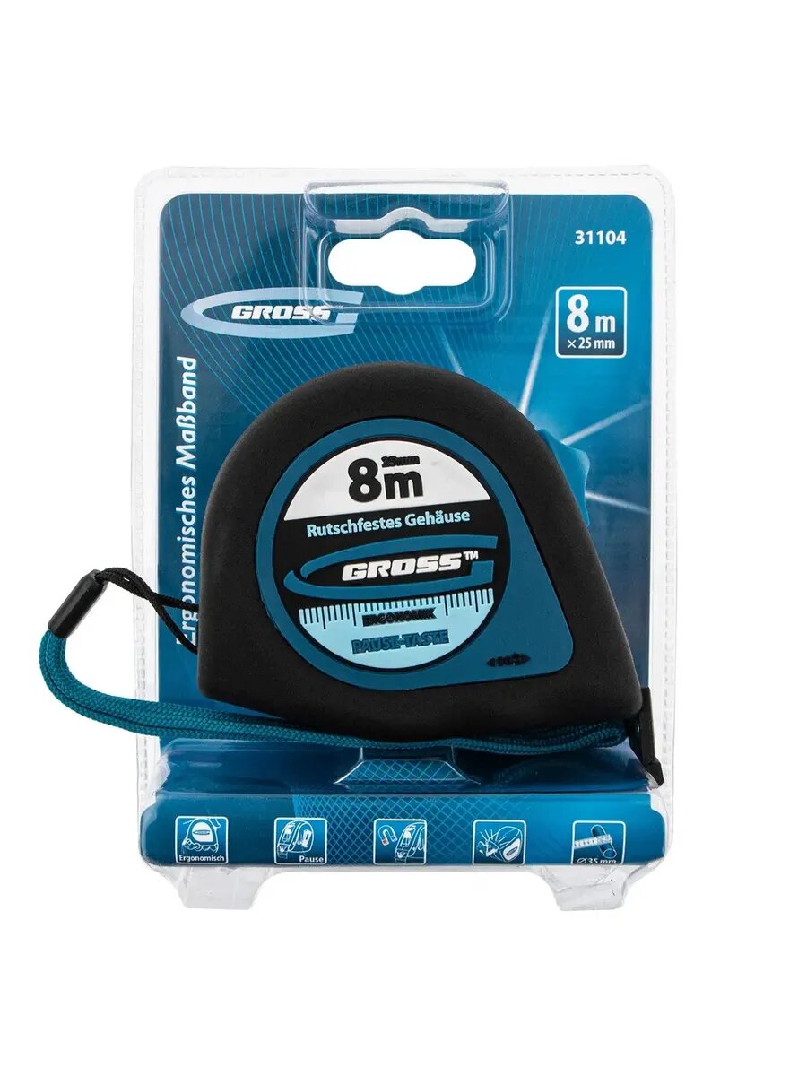 Рулетка Gross «Ergonomisch» 31104 с лентой 8 м х 25 мм и магнитным обрезиненным зацепом пригодится в хозяйстве и на строительной площадке для проведения измерительных работ. Этот карманный инструмент удобно брать с собой на выездные работы. За счет обрезиненного магнитного зацепа полотно можно зафиксировать на металлических поверхностях, также возможно измерение конструкций круглой и изогнутой формы, например, труб. Преимущества Высокая точность измерений от нуля — плавающий зацеп позволяет компенсировать погрешность от его толщины. Удобное проведение замеров — встроенный фиксатор позволяет удерживать полотно на нужной длине. Комфортная эксплуатация — за счет прорезиненного корпуса рулетка не проскальзывает в руке. Надежность — корпус из прочного ABS-пластика выдерживает механические воздействия и падения с небольшой высоты. Долговечность — окрашенное измерительное полотно отличается стойкостью к истиранию. Ремешок на запястье — рулетку можно повесить на руку, чтобы случайно не выронить.