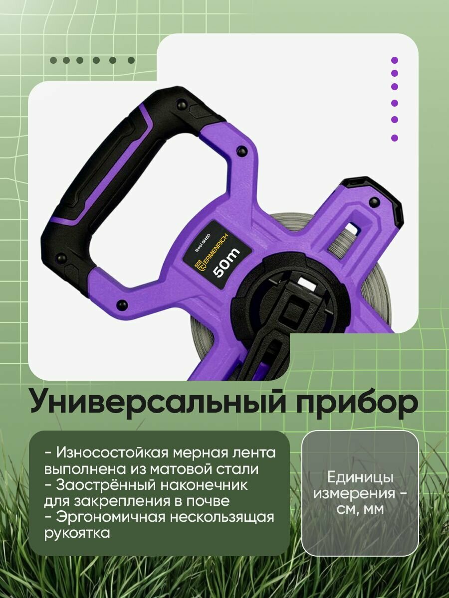 Ermenrich Reel SH50 – геодезический измерительный прибор, предоставляющий возможность получать точные параметры земельного участка без сложных манипуляций и расчетов. Применимость этой мерной ленты длиною в 50 метров обнаруживается во многих ситуациях: от землеустройства и обмера участков вплоть до ландшафтного дизайна. С противоположной от рукоятки стороны корпуса располагается заостренный наконечник, используемый для надежного закрепления рулетки в почве при работе.