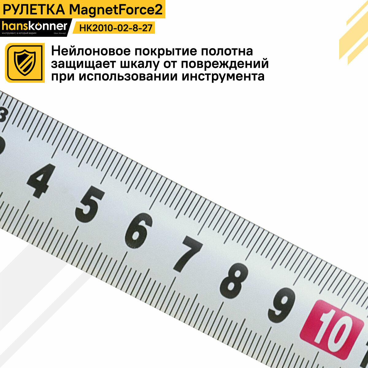 Для повышения износостойкости сталь покрыта зашитым полимерным антикоррозийным слоем, а шкала прочным матовым нейлоном, благодаря чему она не сотрется даже при долгом использовании. Наконечник ленты усилен двойным металлическим желобом для предотвращения обламывания.