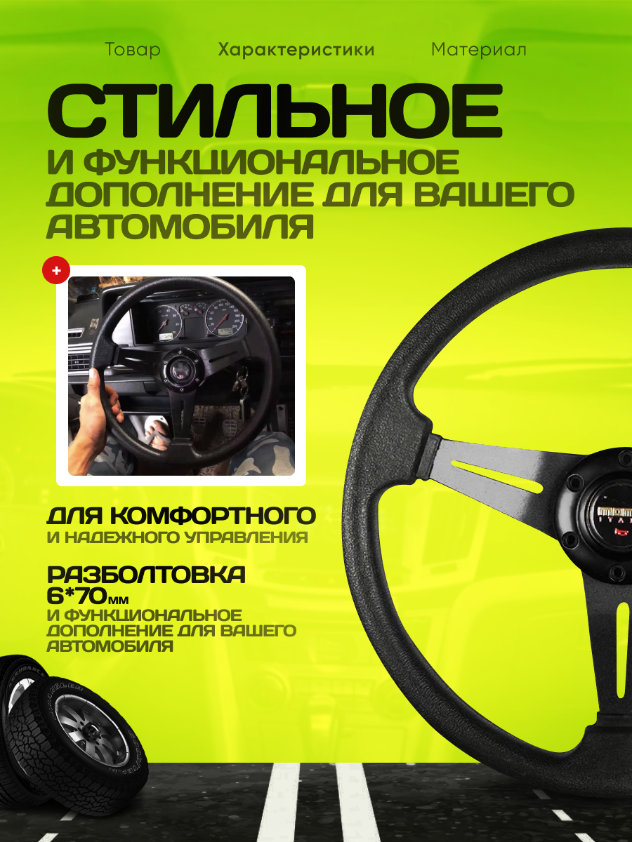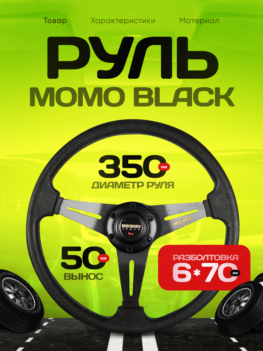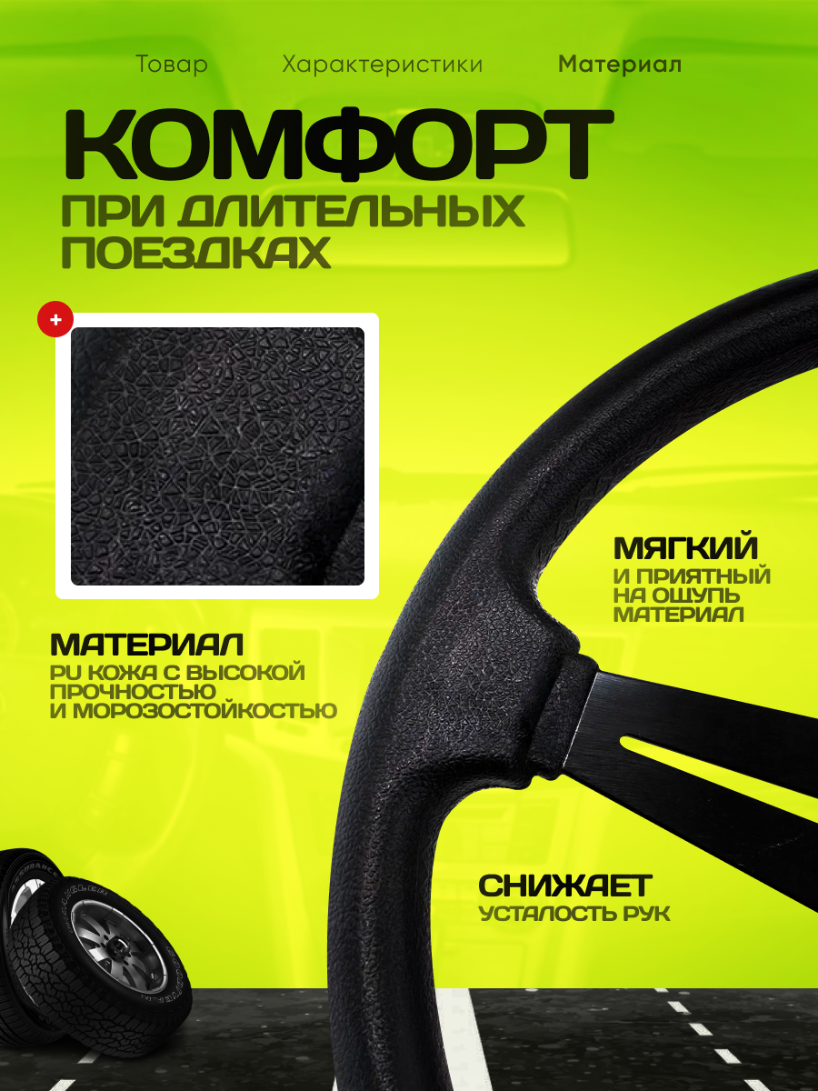 Характеристики: Вынос: 50 мм Диаметр руля: 350 мм Разболтовка: 6*70 мм Материал: PU кожа с высокой прочностью и морозостойкостью (=полиуретан)