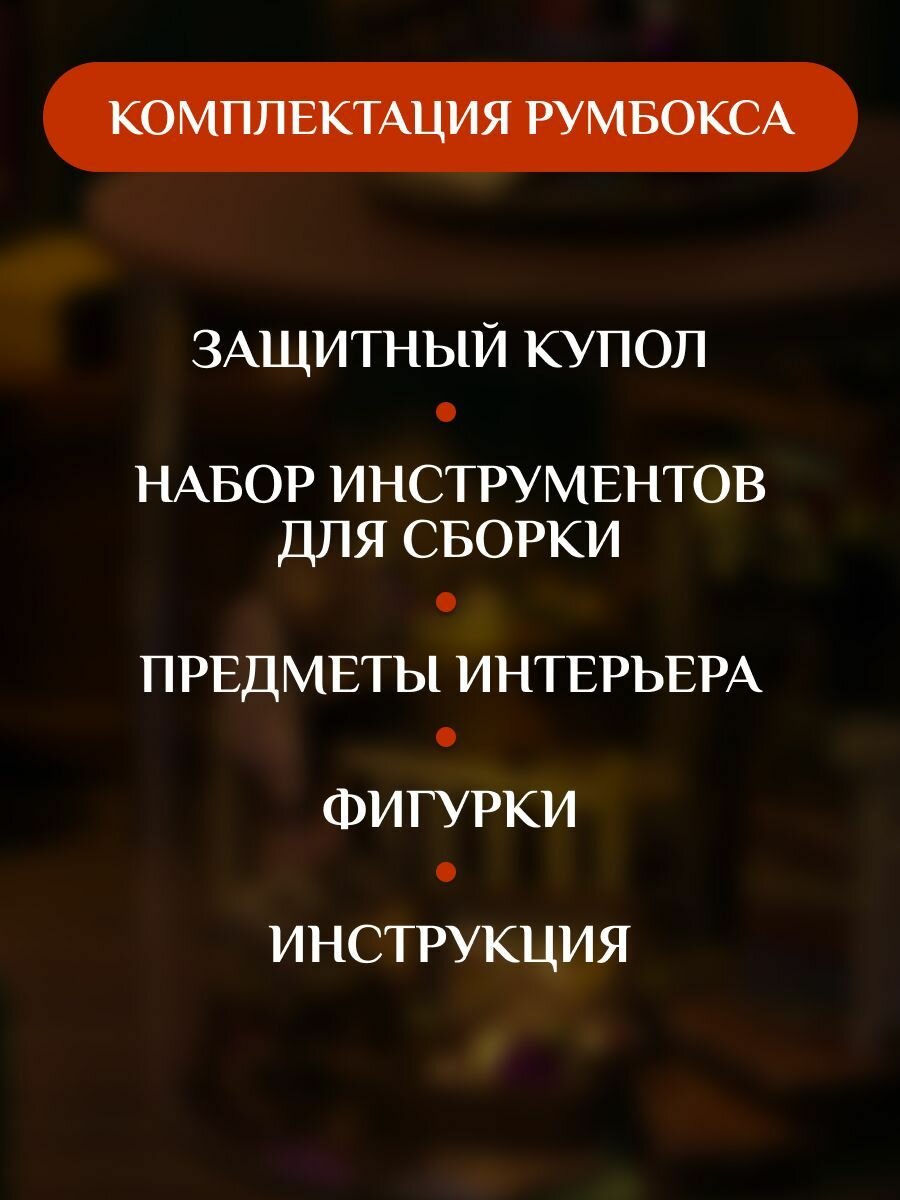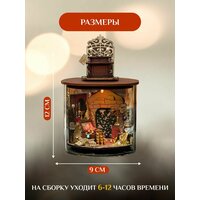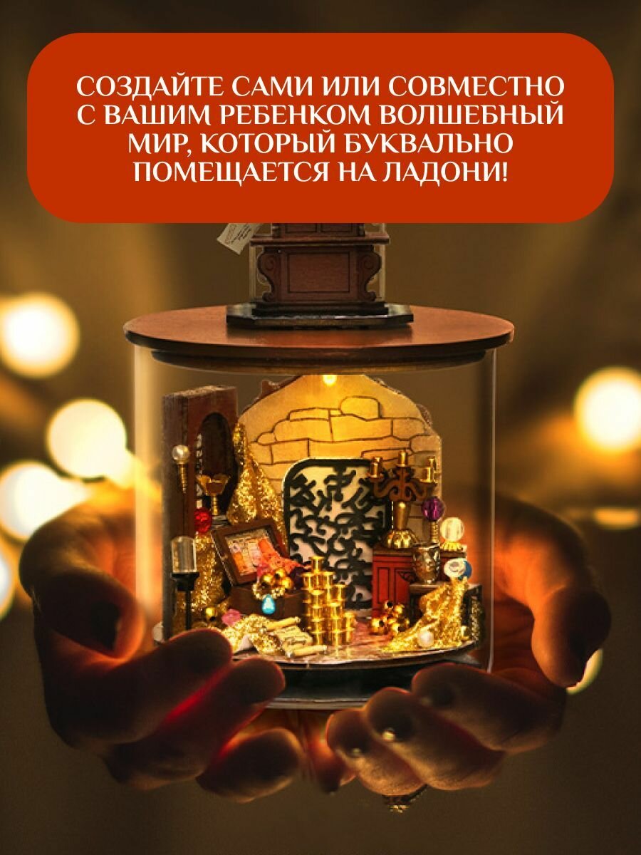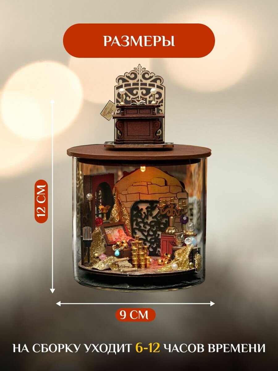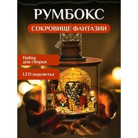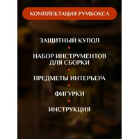 Румбокс «Сокровище фантазии» в тематике историй о Гарри Поттере действительно миниатюрен – его размер в собранной виде 9х15 см, для сохранения изделия от пыли поставляется защитная колба. В комплекте имеется элемент подсветки, создающей поистине магическую атмосферу, поэтому собранная модель может служить не только украшением интерьера, но и ночником.