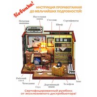 Собранный румбокс может стать необычным элементом декора или домиком для кукол размером 5-7 см. В комплекте вы найдете детали изделия, инструменты (пинцет, линейка), русскую инструкцию, клей и светодиоды для освещения. Для работы необходимы батарейки 2шт ААА (не входят в комплект).