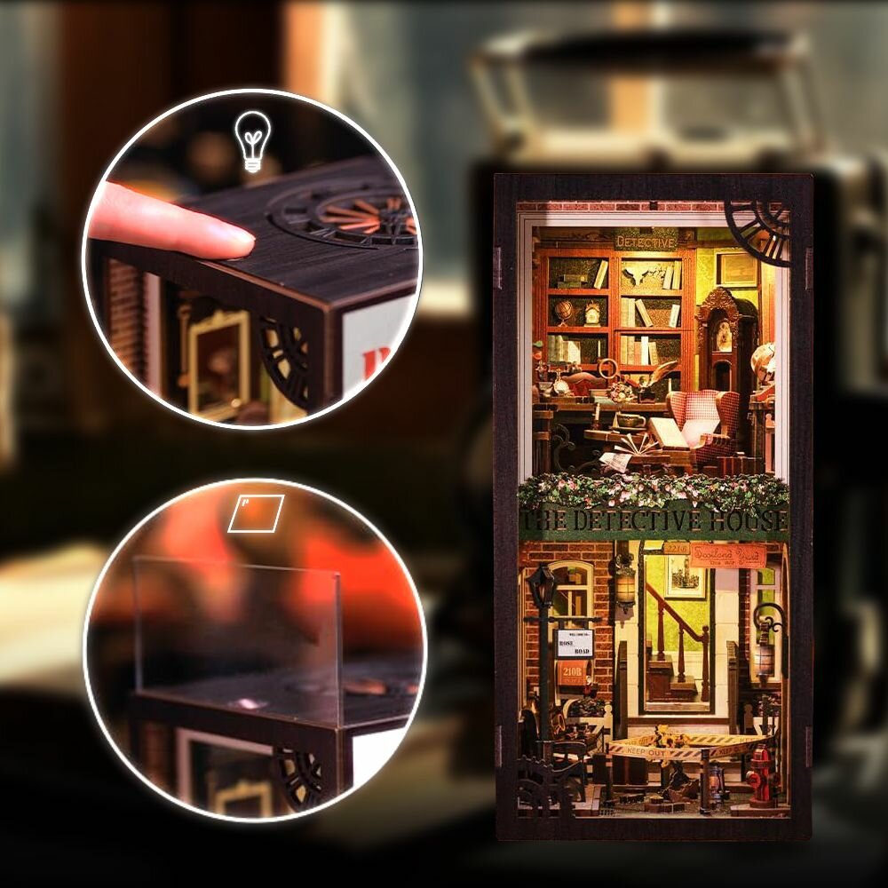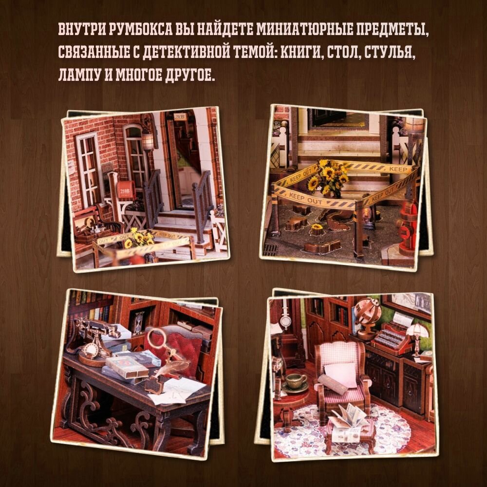 - Детали интерьера: Внутри РумБокса вы найдете миниатюрные предметы, связанные с детективной темой: книги, стол, стулья, лампу и многое другое.