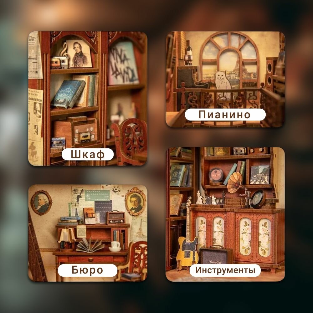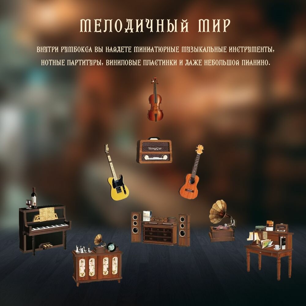 Таинственность и интрига: Внутри РумБокса вы найдете миниатюрные музыкальные инструменты, нотные партитуры, виниловые пластинки и даже небольшой пианино. Это как будто часть реального мира, но в масштабе 1:32.