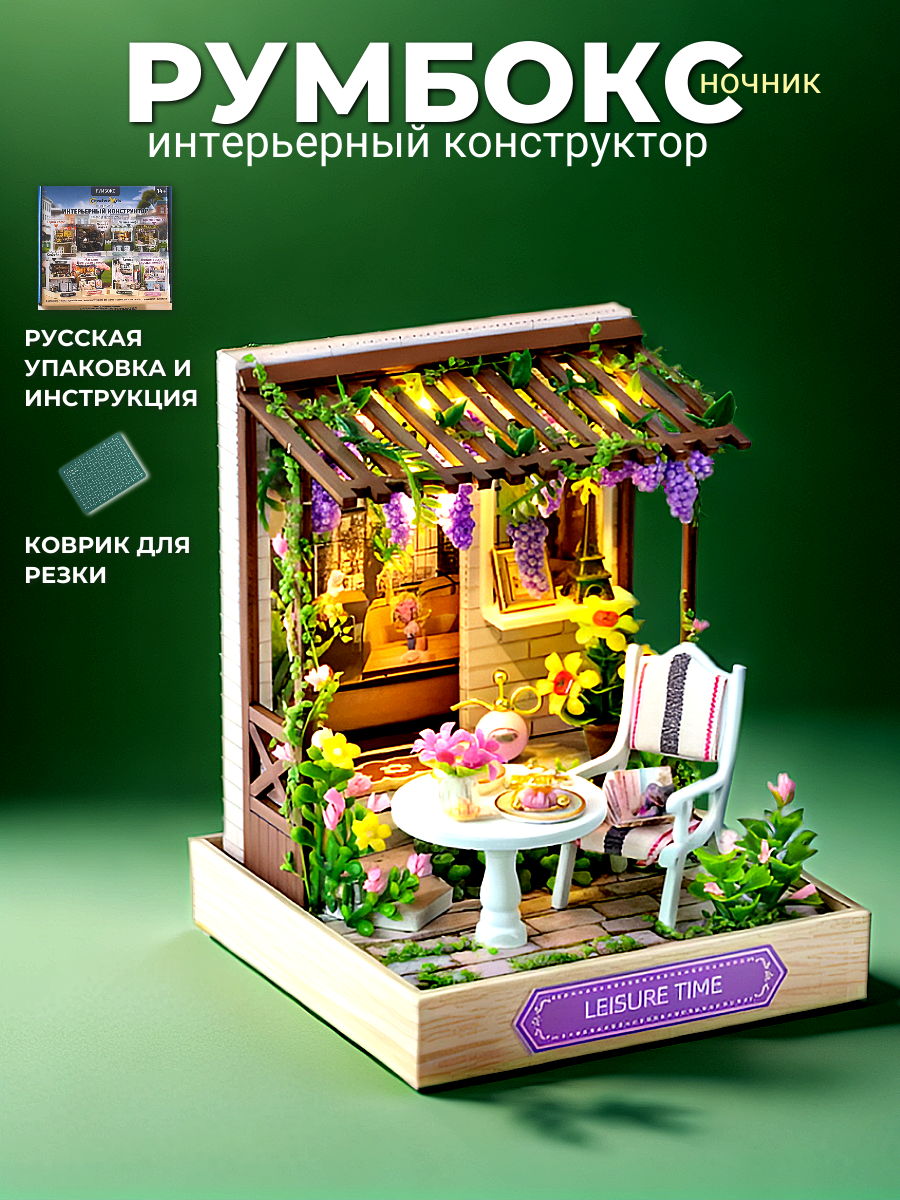 В комплекте с румбоксом "Время отдыха" вы получите все необходимые детали и инструкцию для сборки на русском языке, клей и батарейки, инструменты.