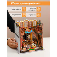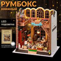 Атмосферный румбокс в виде книжного магазинчика, который оригинально украсит любой уголок вашего дома! Наша сборная модель — настоящая находка для тех, кто давно мечтает о своей мини библиотеке. Книжный румбокс занимает минимум места в доме, но при этом наполняет его своей невероятной атмосферой. Roombox собирается из деревянных, картонных и бумажных деталей, которые нужно самостоятельно вырезать из трафаретов и склеивать между собой. Также в румбокс доме есть текстильные элементы, различные бусины, декоративные детали и светящаяся гирлянда, которая создает уют и волшебную атмосферу внутри миниатюрного домика. Все инструменты из набора очень помогают собрать миниатюры комнат, которые выглядят максимально реалистично и красиво. Внутри mini house diy продумана каждая деталь, чтобы готовая модель производила невероятное впечатление. Процесс сборки такого домика декоративного прекрасно развивает мелкую моторику, усидчивость, внимательность, логику, воображение и творческие способности. Поэтому мини домик румбокс можно подарить и взрослому, и ребенку! Поверьте, от такого подарка в восторге будет каждый. Чтобы полностью собрать домик, понадобится примерно 20 часов. Вы можете собирать его самостоятельно, а можете привлекать к процессу всю семью! Сам процесс очень увлекательный и интересный, а результат просто поражает. Все детали румбокс домика отполированы и обработаны от заусенцев, поэтому даже дети могут безопасно принимать участие в сборке домика под присмотром взрослых. Используйте румбокс в качестве оригинального украшения днем и красивого светильника ночью — гирлянда потрясающе освещает весь домик, дарит атмосферу тепла и уюта. Сделайте оригинальный подарок себе или близким, которые ищут увлекательное хобби! Мини домики своими руками — это супер интересное занятие как для одного человека, так и для большой компании. Дополните свой интерьер стильным и необычным элементом. Соберите свой книжный магазинчик и наслаждайтесь его атмосферой каждый день!