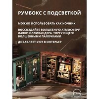 DIY конструктор «Магазин волшебных палочек» или «Лавка Олливандера» - это волшебный магазин из Гарри Поттера с реалистичным детальным интерьером в волшебном стиле. Румбокс или DIY House – это миниатюрный магазин со всеми подробностями интерьера и быта, который нужно собрать самостоятельно. Главный смысл и ценность румбокса именно в процессе его создания. В наборе для самостоятельной сборки от Yarvita используются только экологичные материалы – дерево, ткани, бумага, LED-светодиоды. Все детали удобно разложены по пакетам и подписаны, цветная инструкция на русском языке подробная, разобраться легко. Миниатюрный конструктор упакован в красивую подарочную коробку. В комплект входят все необходимые детали для сборки в индивидуальных упаковках, а также пошаговая инструкция. Интерьерный конструктор - это готовый набор для творчества взрослых и детей, внутри которого Вы найдете все необходимое, чтобы воссоздать собственными руками реалистичный дом в миниатюре, используя клей и ножницы, а лампы-светильники придают особую атмосферу волшебства! Собранная миниатюра станет украшением Вашего дома в новогодние праздники. Если Вы купили подарочный бокс ребенку, рекомендуется собирать его вместе с ним. Ориентировочное время сборки 20 часов. Детали конструктора изготавливаются на высокоточном лазерном станке и содержат мелкие части, которые придают реалистичность готовой модели. Завершающим штрихом будет проводка электричества для миниатюрных светильников, работающих от батарейки. Конструктор для самостоятельной сборки магазина Гарри Потер с освещением очень уютный и реалистичный. Размер готового кукольного домика 28,5х14х14,5 см. Интерьерный конструктор для взрослых и детей, девочкам и мальчикам это оригинальный подарок на праздники, подарок на день рождения, на новоселье, на 8 марта. Румбокс Гарри Поттер. Погрузитесь в сказочный мир миниатюры! В нашем магазине Вы найдете готовые наборы для хобби и творчества детям и взрослым, оригинальную технику и аксессуары.