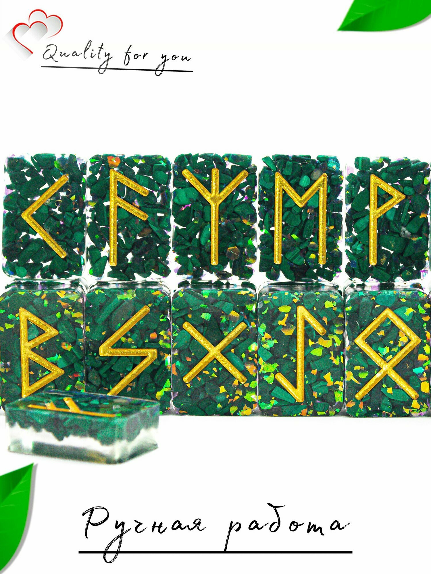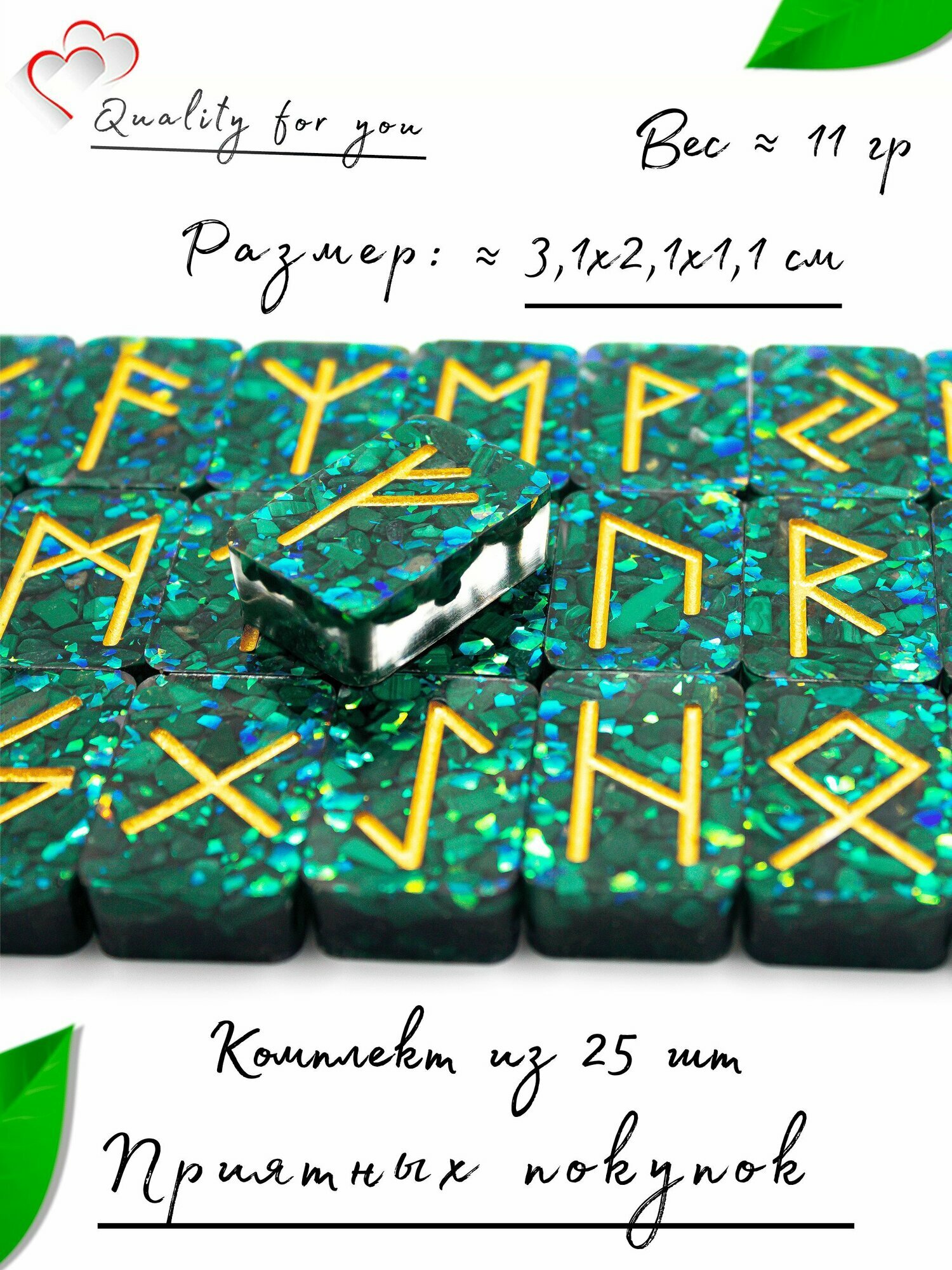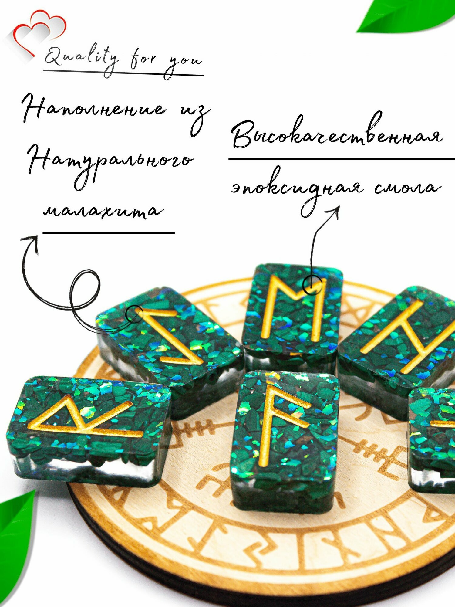 Каждая руна тщательно изготовлена из натурального камня, что гарантирует уникальность и натуральность данного набора. Использование рун из малахита позволяет настроиться на нужные вибрации и получать более точные предсказания. Кроме того, данный материал хорошо известен своими свойствами — он помогает справляться со стрессом и способствует гармонии.