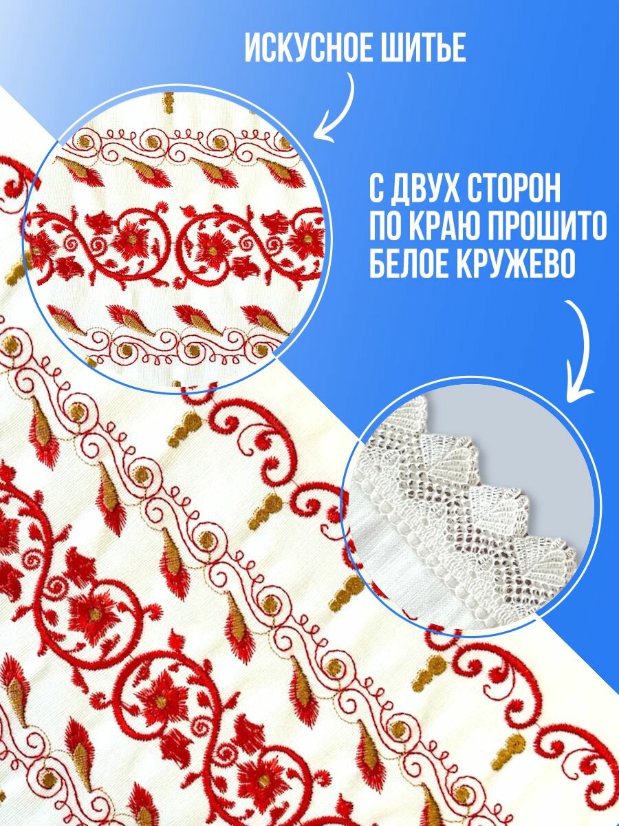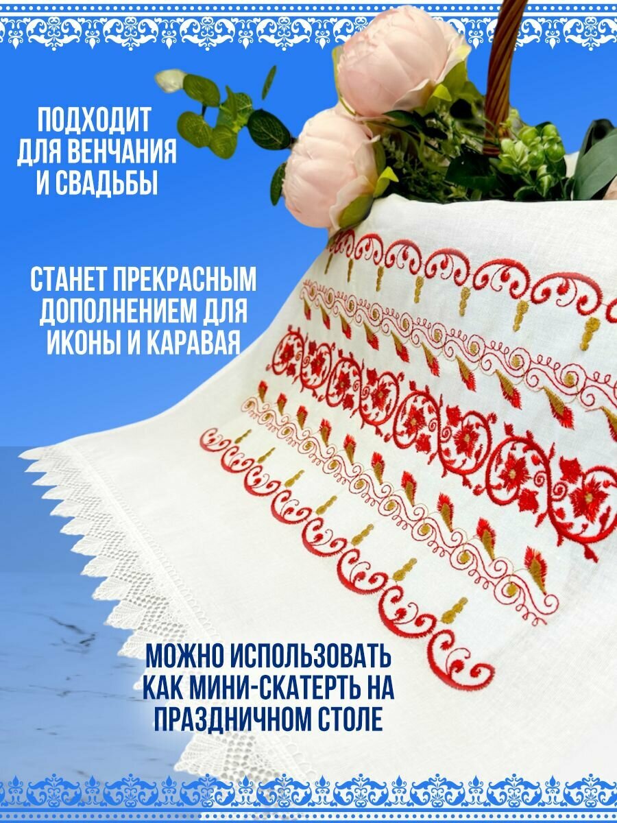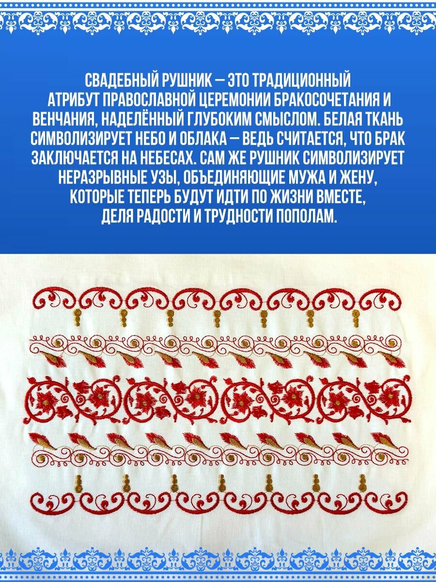 Рушник свадебный - это символ любви, символизирующий чистоту и благополучие в семейной жизни. Наши венчальные рушники изготовлены из высококачественного материала – лен с вышивкой, что делает их неповторимыми и прекрасными для особого события. Свадебный рушник под иконы и под каравай может использоваться как для церемонии венчания, а так же как украшение для стола на свадьбу. Полотенце для венчания и под каравай - неотразимые свадебные украшения, которые станут отличным дополнением к подарку на свадьбу молодоженам. Рушники свадебные для иконы доступны в белом цвете. Ручник размером 150х48 см. Рушник под иконы так же подойдет под ноги во время церемония венчания . Пусть этот день запомнится не только радостью и счастьем, но и прекрасными деталями, которые создадут уникальную атмосферу вашего торжества. Уверены, что наши белые рушники для венчания станут идеальным выбором для вас и ваших близких!