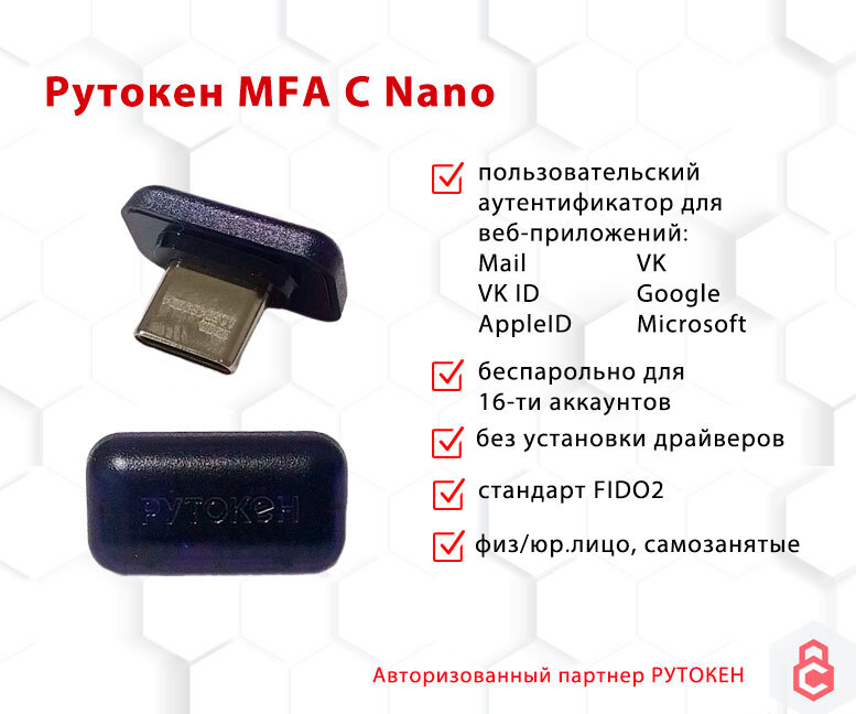 Рутокен MFA C Nano, предназначен для аутентификации в веб-приложениях. Устройства разработаны на базе стандартов универсальной пользовательской аутентификации FIDO2.