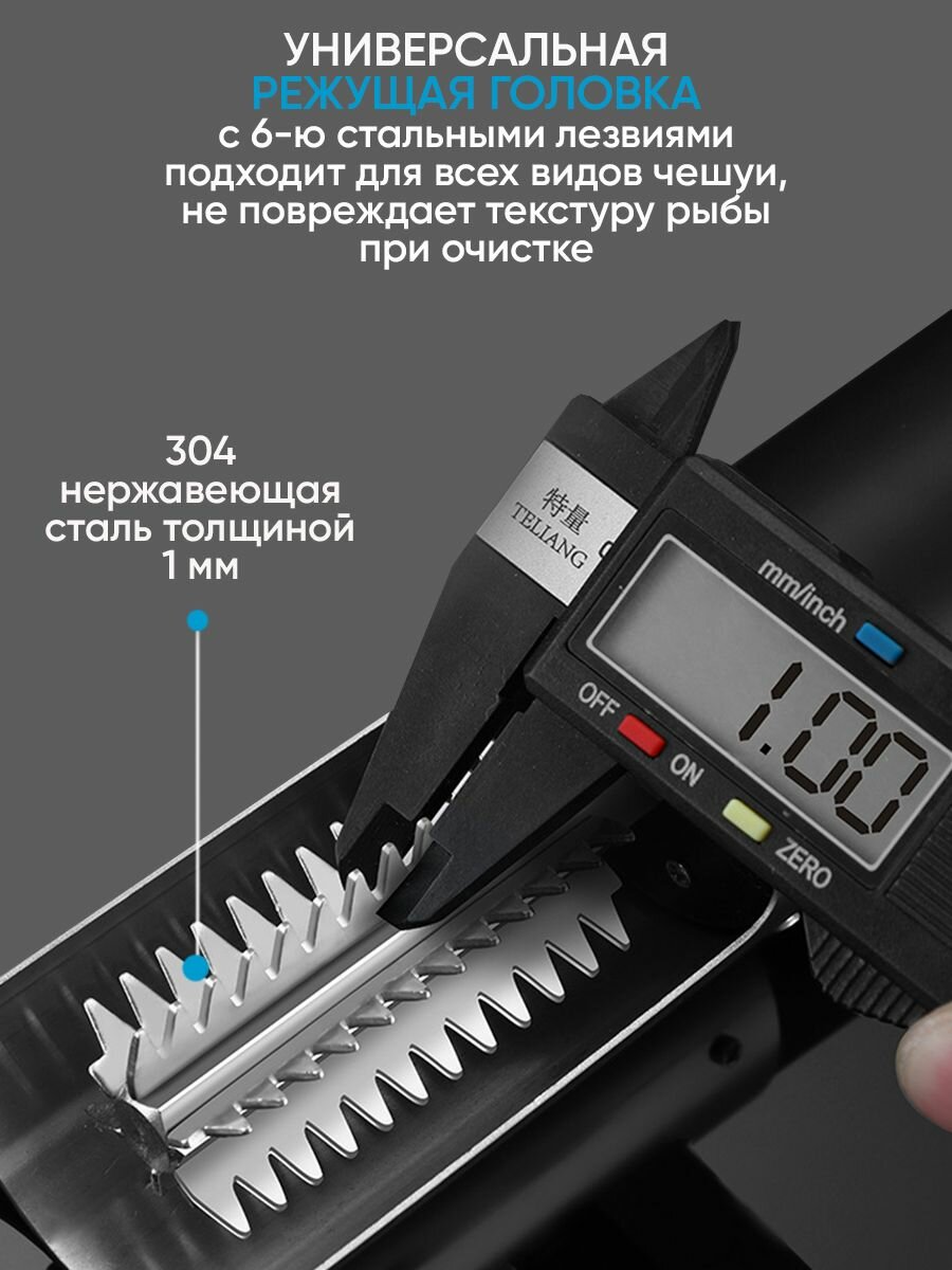 Универсальная режущая головка с 6 лезвиями из нержавеющей стали подходит для чистки морской и пресноводной рыбы любого размера. Рекомендуем обращать внимание именно на такую конструкцию, так как аналоги с 4 лезвиями чистят заметно медленнее и менее деликатно.