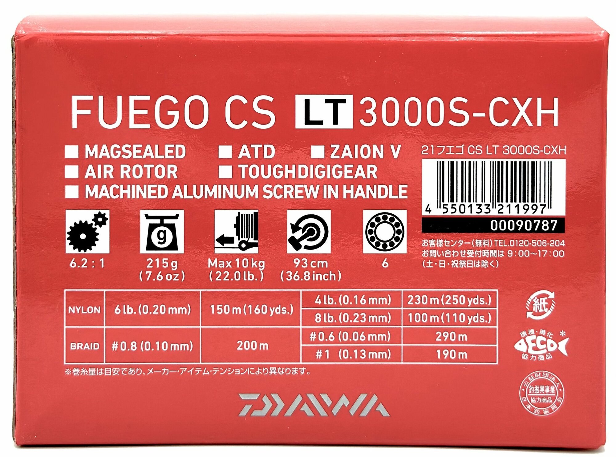 Fuego 21 CS LT - последнее обновление популярной линейки катушек от японского бренда Daiwa, вышедшее в 2021 году. Это третья версия Fuego, выполненная в концепции LT. Для изготовления этой серии был применен материал Zaion V, за счет чего безынерционки стали еще надежнее, крепче и легче. В обновленной Fuego использована защита Mag Sealed. В этой серии использован легкий полый ротор Air Rotor и трубчатая дужка AirBail. Внутри установлен механизм Digigear. Фрикцион нового поколения ATD расположен спереди. Алюминиевая шпуля с перфорацией стала легче, тоньше и меньше. За счет строения ее бортика улучшается дальность заброса. В конструкции Daiwa Fuego 21 CS LT использован мгновенный стопор обратного хода Infinite Anti-Reverse и ролик лесоукладывателя Twist Buster 2.