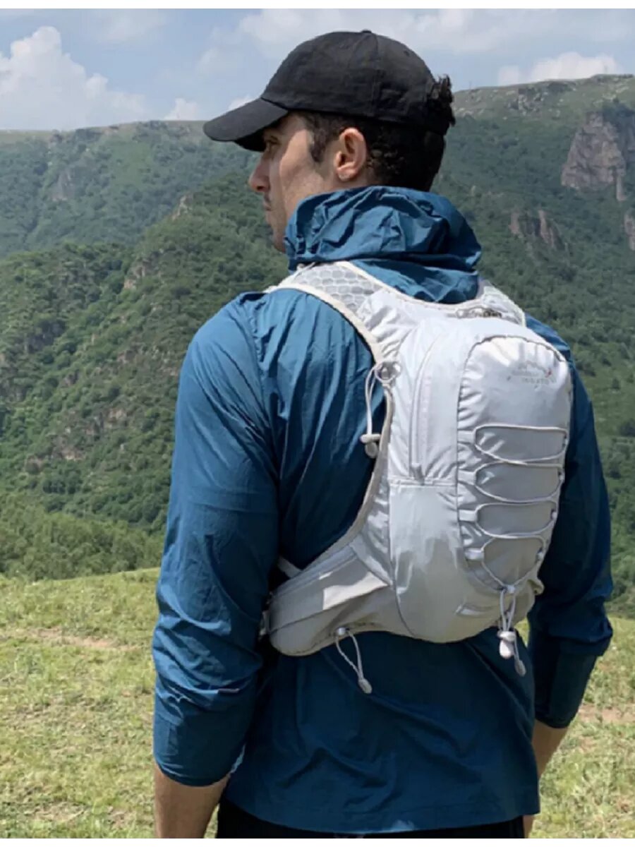 Без гидратора! Самый удобный маленький лёгкий спортивный рюкзак для бега, вместимостью 12 литров, облегающий фигуру. В этой модели собран весь функционал, который требуется для долгой физической работы. Он подойдет, если Вы отправляетесь на длинный велозаезд или ультрамарафонский бег, в горы кататься на сноуборде или просто в дневной пеший треккинг по диким местам. Возьмите с собой все, что необходимо для комфортного преодоления дистанции. Весь функционал представлен на фото, подробнее опишем основные свойства. Рюкзак предназначен для использования его с питьевой системой - гидратором. Для этого предусмотрено все необходимое - отдел для пакета воды, карман для вывода трубки, жесткие и мягкие фиксаторы шланга. Пейте воду не останавливаясь и не теряя времени! Так же, в передней части рюкзаказа на плечевых лямках есть эластичные карманы под бутылочки или мягкие фляги. Идеально влезает объем 0,5 литра. На грудном ремне есть спасательный свисток на случай непредвиденной ситуации. По бокам основного отделения можно крепить треккинговые палки, это очень удобно на спусках, помогает освободить руки. Эластичные карманы в области талии нужны для хранения мелочей. Спинка рюкзака, плечевые ремни и ремни на талии выполнены из дышащего материала EVA с множественными отверстиями для выведения влаги. Ткань, из которой изготовлен велорюкзак имеет водоотталкивающую пропитку, Ваши вещи будут под надежной зашитой в дождь с непромокаемым рюкзаком. Передняя пряжка в области груди имеет несколько положений, что позволяет закрепить её по индивидуальному желанию. Рюкзак хорошо зарекомендовал себя на забегах по трейлраннингу, скайраннингу и горным туристическим походам. В него помещается вся обязательная экипировка и остается место для личных вещей.