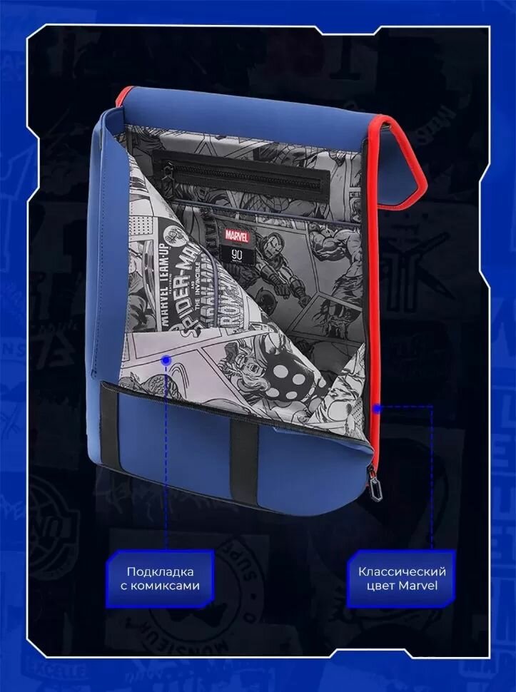 Особенности и преимущества: 1. Дизайн и стиль: Рюкзак выполнен в стиле Marvel, что делает его отличным аксессуаром для поклонников комиксов и фильмов. Яркий синий цвет и уникальные элементы дизайна, вдохновленные супергероями, придают изделию оригинальность.