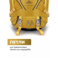 Легкая модель подойдет для походов выходного дня или на несколько дней, альпинизма, путешествий, так и в качестве дорожного рюкзака (сумки). Доступ в основное отделение осуществляется через верхний клапан, фронтальный или нижний вход, благодаря чему легко и удобно положить или вытащить всё необходимое. Конструкция спинки обладает превосходной вентиляцией, поэтому будет очень комфортна в жарких условиях и при высокой интенсивности ходьбы. При собственном небольшом весе, рюкзак обладает высокой прочностью и износостойкостью, изготовлен из нейлоновой ткани 420 D. Материал: нейлон 420D Размеры: 38х62х15 см Объем 35+5 л Вес 1,16 кг Вентилируемая спина Чехол от дождя в комплекте Вход снизу на молнии Карманы на поясном ремне Карман для питьевой системы Технический карман для извлечения каркаса Петли для треккинговых палок или ледоруба Свисток на грудной пряжке Молнии YKK