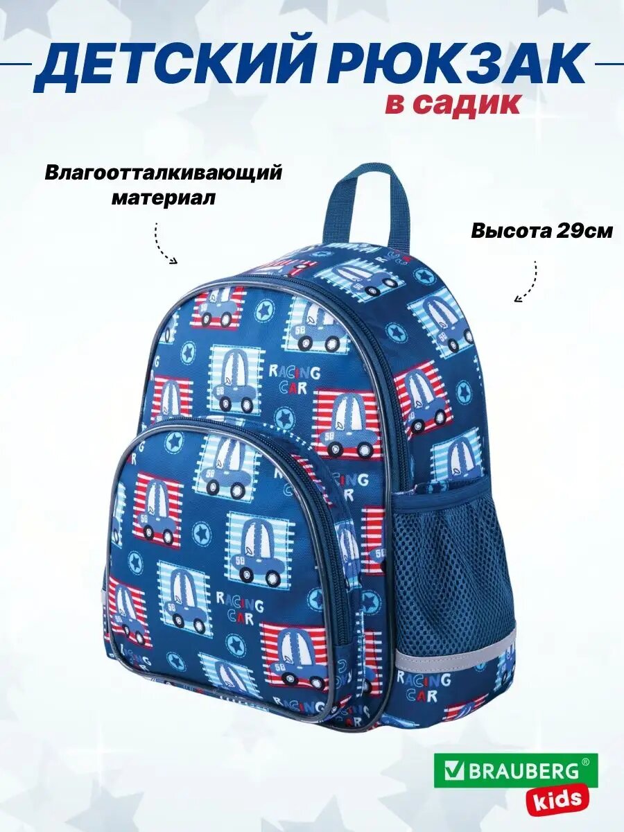 Рюкзак Brauberg Kids «Cars», влагозащитный, светоотражающий, для дошкольников, высота 29 см: сравнение цен, характеристики, фото, актуальное наличие и цены.