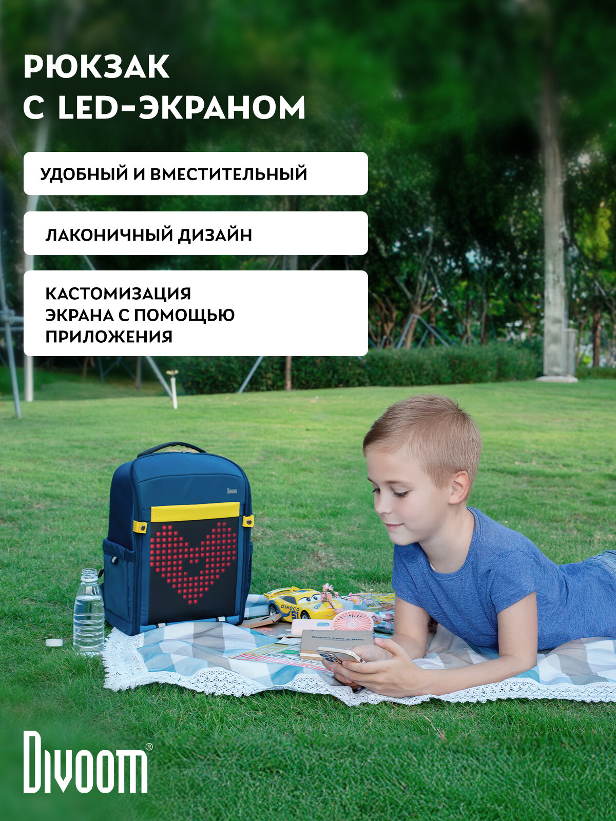 Рюкзак Divoom S подчеркнет вашу индивидуальность - будьте ярче, фантазируйте, создавайте изображения и переносите их на цветной LED-экран! Вместительный, но при этом компактный и легкий (менее килограмма!) рюкзак изготовлен из дышащих материалов и создан для комфорта в любых условиях благодаря жесткой спинке и защите от дождя. С этим рюкзаком вы в безопасности и днем, и ночью! Просто установите на экран стоп-сигнал во время движения на самокате, велосипеде или роликах. А дополнительные светоотражающие вставки сделают вас более заметными в темное время суток! Внутри есть всё необходимое: отделения для ноутбука или планшета, книг, тетрадей, кармашки под канцелярию и прочие мелочи. Поместится даже тренировочная форма и бутылка с водой!