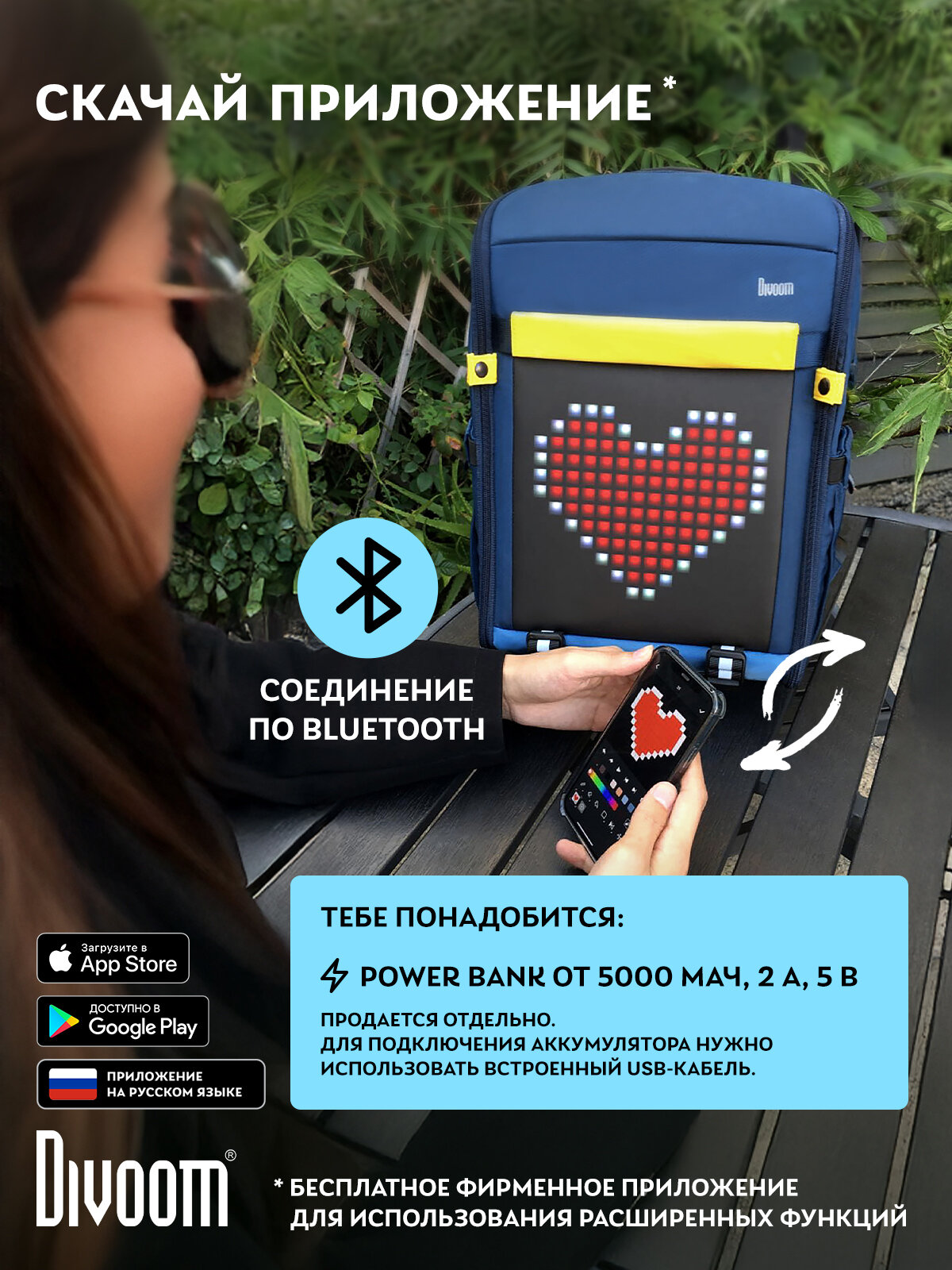 Выделяйтесь из толпы и делитесь своим настроением, любимым хобби или просто дарите окружающим кучу положительных эмоций. Подключайтесь к сумке или рюкзаку Divoom со своего смартфона, чтобы по максимуму использовать возможности многофункционального экрана, такие как оповещения о важных событиях или специальные сигналы для безопасной езды по городу.