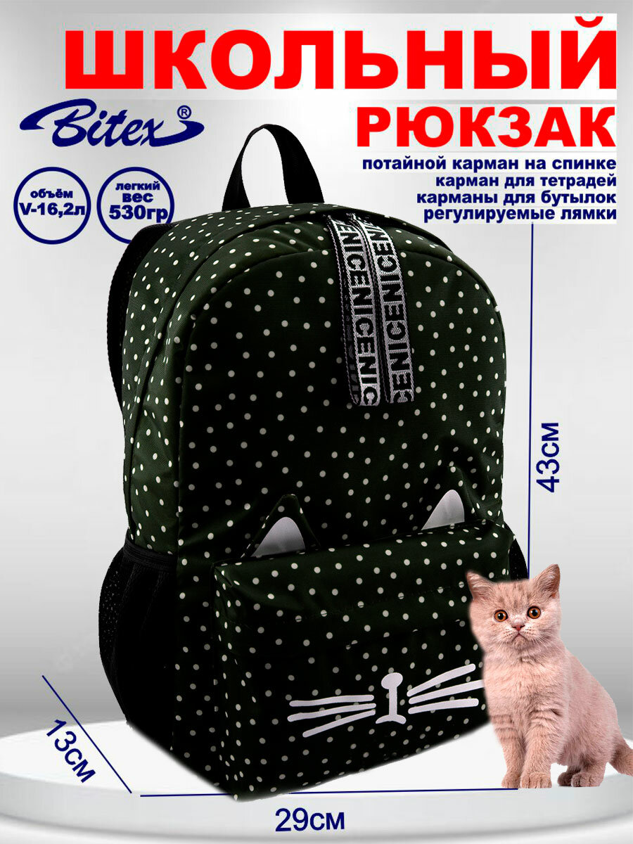 Рюкзак для девочки BITEX 28-150 с кошачьими ушками, черный горошек, городской, 16л: сравнение цен, характеристики, фото, актуальное наличие и цены.