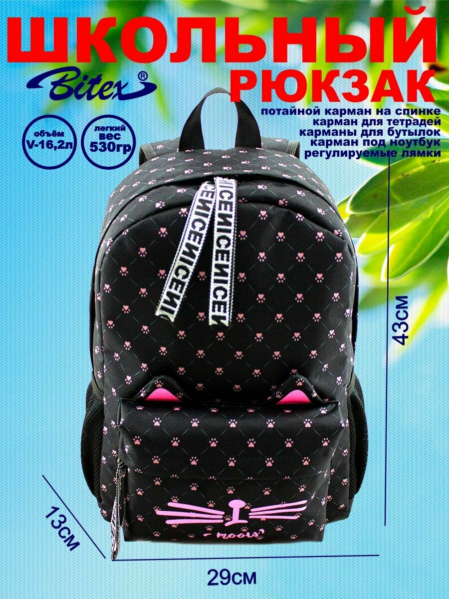Рюкзак для девочки BITEX 28-150 с кошачьими ушками, городской, непромокаемый, 16л, черный/розовые лапки: сравнение цен, характеристики, фото, актуальное наличие и цены.