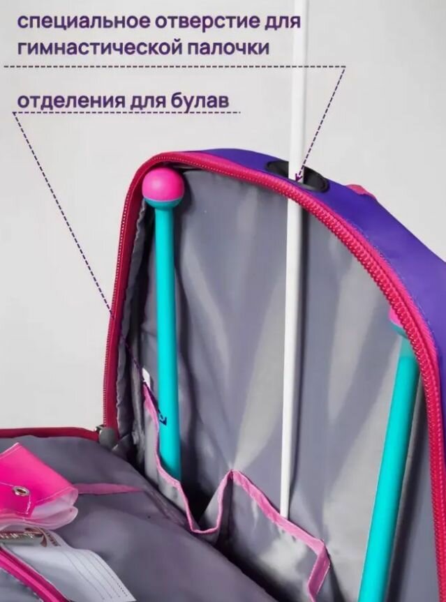 В рюкзаке находятся отделения для ленты, булав, скакалки, мяча. Сверху рюкзака сделана резиновая прорезь для удобной переноски гимнастической палочки.