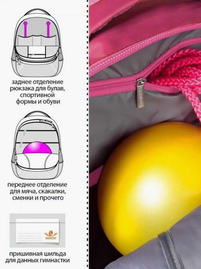 В рюкзаке находятся отделения для ленты, булав, скакалки, мяча. Сверху рюкзака сделана резиновая прорезь для удобной переноски гимнастической палочки.