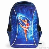Цвет женского рюкзака темно синий с ярким принтом гимнастки с олимпийским обручем на сине-голубом фоне.