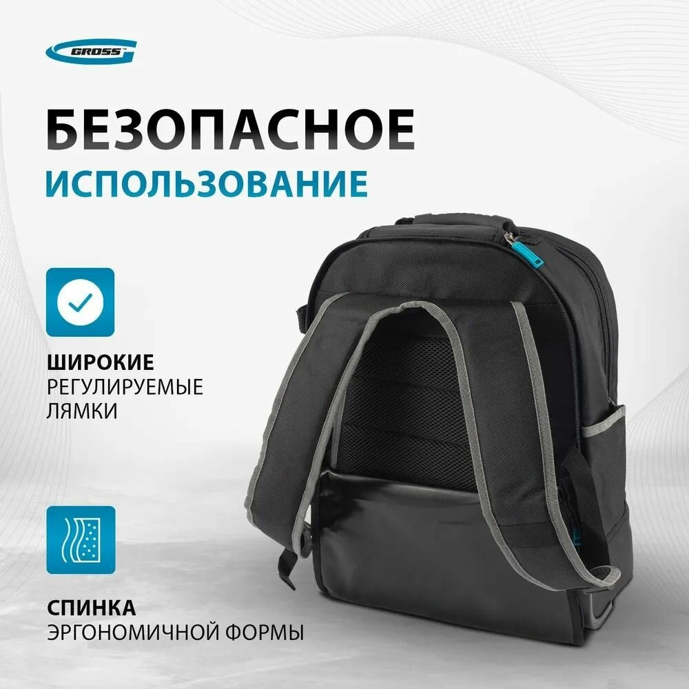 Рюкзак Gross 90275 размером 440 х 350 х 250 мм, с выдвижной рукояткой и колесами, используется для хранения и транспортировки ручного инструмента. В двух секциях с 16 внутренними и внешними карманами можно разместить все необходимые предметы. Рюкзак удобно брать в поездки и на выездные работы.