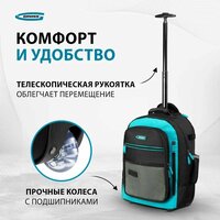 - Удобная транспортировка — колеса и телескопическая ручка облегчают перемещение рюкзака.