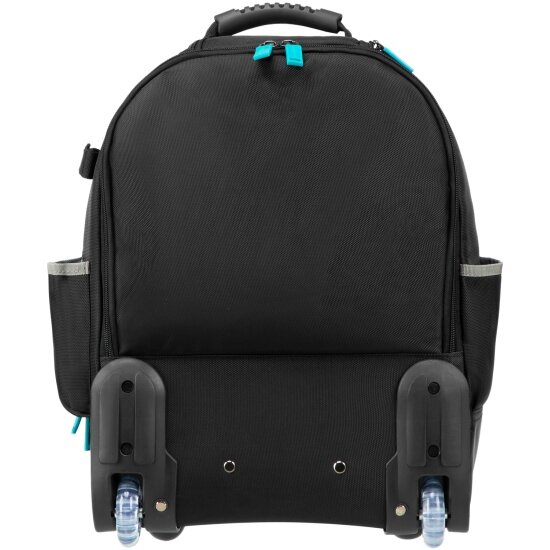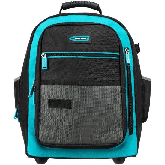 Рюкзак Gross 90275 размером 440 х 350 х 250 мм, с выдвижной рукояткой и колесами, используется для хранения и транспортировки ручного инструмента. В двух секциях с 16 внутренними и внешними карманами можно разместить все необходимые предметы. Рюкзак удобно брать в поездки и на выездные работы.