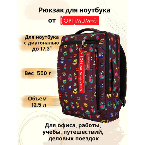 Рюкзак Optimum 17.3 RL, губы - это яркий стильный рюкзак - сумка для ноутбука, нетбука, компьютера, планшета. Рюкзак для ноутбука универсальный – его можно использовать как рюкзак для ноутбука 15.6 дюймов, так и рюкзак для ноутбука 17.3 дюйма. Совместим со всеми марками ноутбуков DELL HP Samsung Apple MacBook Acer Asus Lenovo Honor Xiaomi Msi Irbis Digma с размерами экрана 15 15.6 16 17 17.3 дюйма. Подходит для макбука, ультрабука. Есть специальный карман для документов формата A4 и аксессуаров. Компактный (объемом 12.5 литров), облегченный, надежный, эргономичной формы рюкзак для офиса, работы, учебы, путешествий и деловых поездок. Optimum 17.3 RL - это рюкзак унисекс - рюкзак для ноутбука женский, так и рюкзак для ноутбука мужской. На задней стенке ремень - крепление на ручку чемодану. Две широкие мягкие регулируемые лямки обеспечат комфорт в дороге. Лямки можно отстегнуть и спрятать в карман, а 2 удобные мягкие ручки сверху и сбоку позволят использовать изделие как деловую бизнес сумку. Рюкзак выполнен из качественной, износостойкой, высокопрочной ткани с водоотталкивающей пропиткой. Специальное отделение - отсек для ноутбука с подкладкой из неопрена, надежно защитит гаджет от ударов. 3 наружных кармана для аксессуаров, powerbank, ключей, очков. Рюкзак женский для ноутбука - стильный, яркий, модный. Рюкзак мужской для ноутбука – деловой рюкзак для города и командировок. Рюкзак для ноутбука 16 можно использовать для небольших путешествий, перелетов и прогулок по городу, для удобного и безопасного перемещения ноутбука. Рюкзак пригодится для работы фрилансеров, для учебы студентам, подросткам, мальчикам, девочкам. Отличный подарок на день рождения другу, подруге, коллеге.