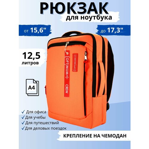 Рюкзак Optimum 17.3 RL, оранжевый - это яркий стильный рюкзак - сумка для ноутбука, нетбука, компьютера, планшета. Рюкзак для ноутбука универсальный – его можно использовать как рюкзак для ноутбука 15.6 дюймов, так и рюкзак для ноутбука 17.3 дюйма. Совместим со всеми марками ноутбуков DELL HP Samsung Apple MacBook Acer Asus Lenovo Honor Xiaomi Msi Irbis Digma с размерами экрана 15 15.6 16 17 17.3 дюйма. Подходит для макбука, ультрабука. Есть специальный карман для документов формата A4 и аксессуаров. Компактный (объемом 12.5 литров), облегченный, надежный, эргономичной формы рюкзак для офиса, работы, учебы, путешествий и деловых поездок. Optimum 17.3 RL - это рюкзак унисекс - рюкзак для ноутбука женский, так и рюкзак для ноутбука мужской. На задней стенке ремень - крепление на ручку чемодану. Две широкие мягкие регулируемые лямки обеспечат комфорт в дороге. Лямки можно отстегнуть и спрятать в карман, а 2 удобные мягкие ручки сверху и сбоку позволят использовать изделие как деловую бизнес сумку. Рюкзак выполнен из качественной, износостойкой, высокопрочной ткани с водоотталкивающей пропиткой. Специальное отделение - отсек для ноутбука с подкладкой из неопрена, надежно защитит гаджет от ударов. 3 наружных кармана для аксессуаров, powerbank, ключей, очков. Рюкзак женский для ноутбука - стильный, яркий, модный. Рюкзак мужской для ноутбука – деловой рюкзак для города и командировок. Рюкзак для ноутбука 16 можно использовать для небольших путешествий, перелетов и прогулок по городу, для удобного и безопасного перемещения ноутбука. Рюкзак пригодится для работы фрилансеров, для учебы студентам, подросткам, мальчикам, девочкам. Отличный подарок на день рождения другу, подруге, коллеге.