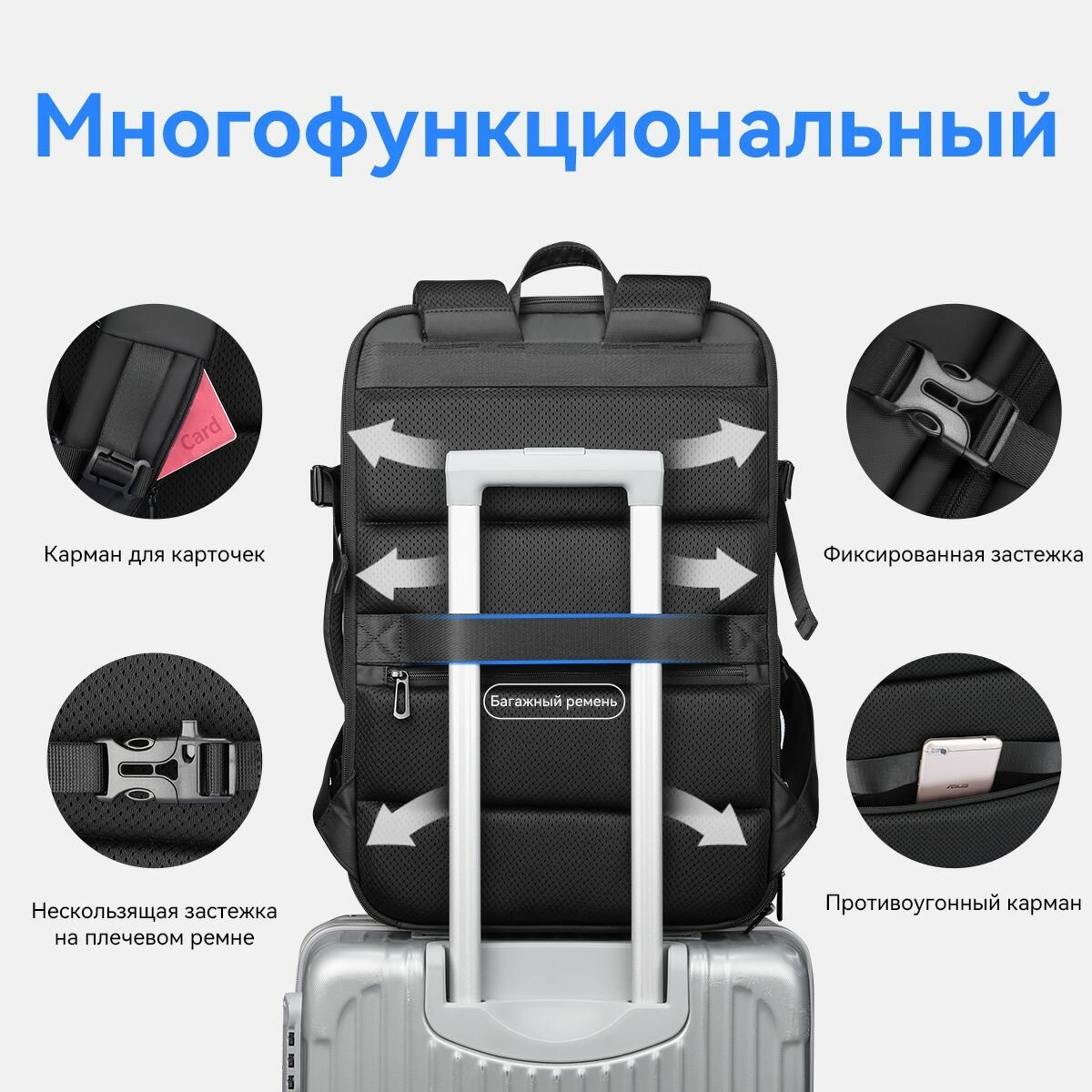 MR8057 — это многофункциональный рюкзак, который можно использовать в качестве повседневного рюкзака, разрешенной к полетам ручной клади или прикреплять к багажу для освобождения рук: ремень сзади позволяет прикрепить рюкзак к трубке ручки багажа и рюкзаку для укрытия ремни.