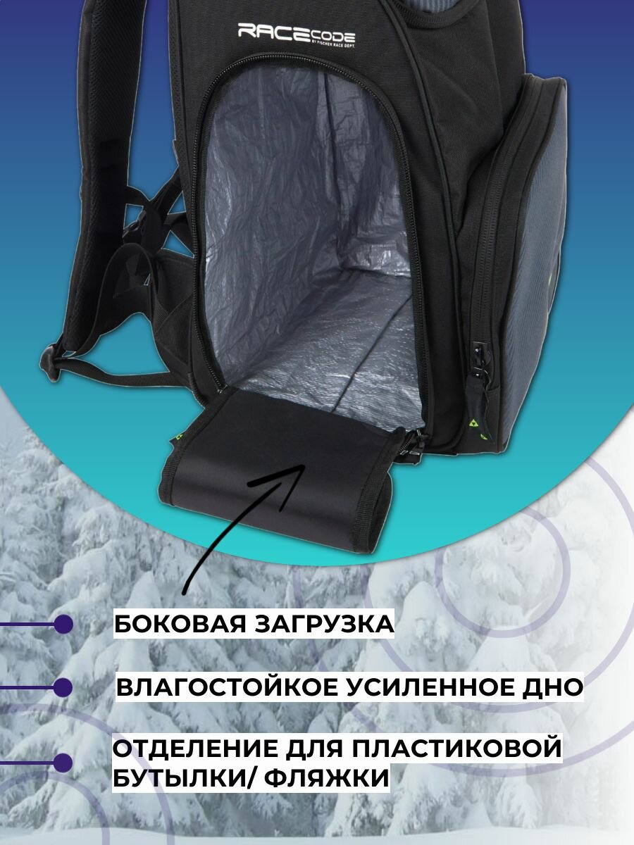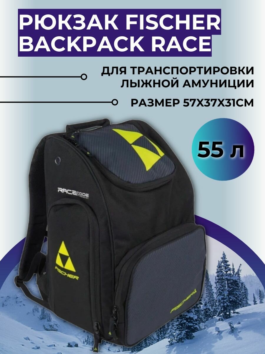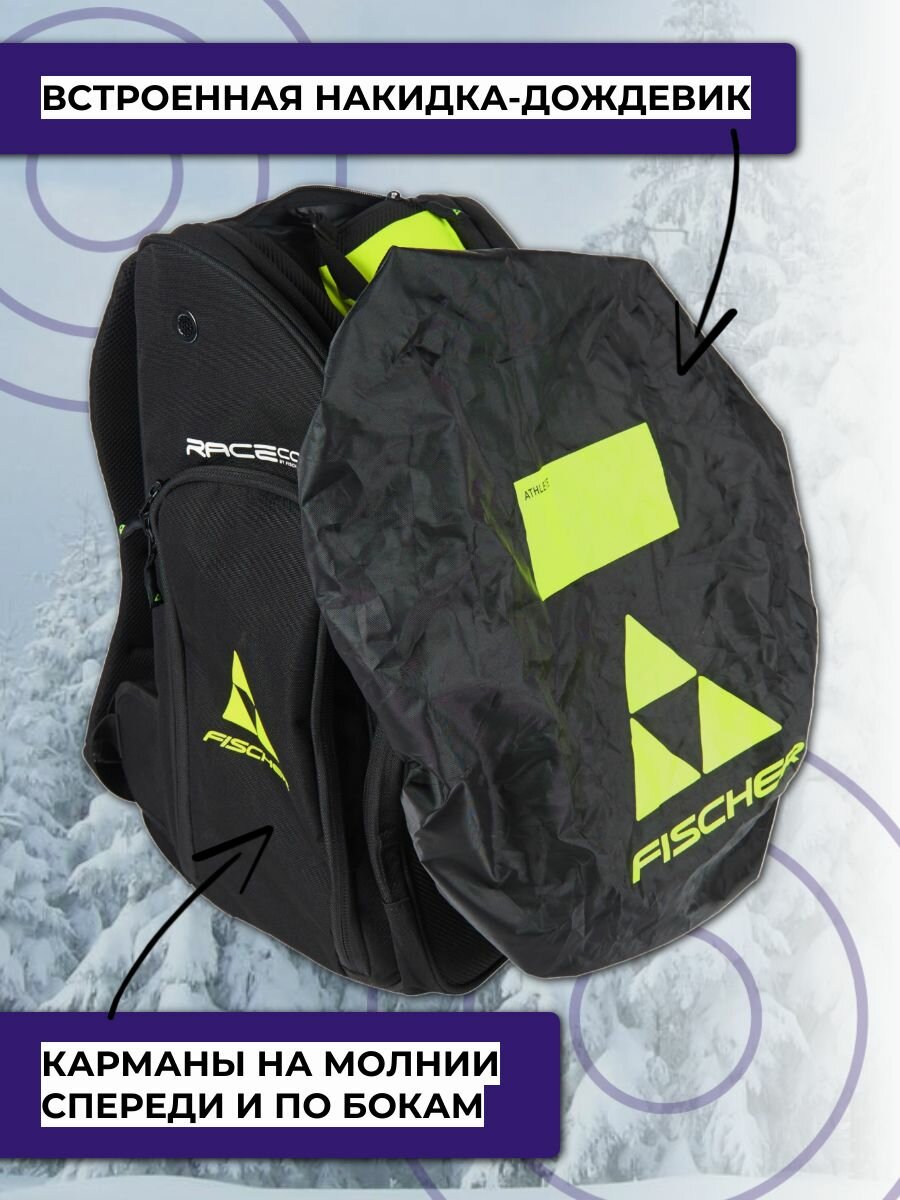 FISCHER BACKPACK RACE 55L - практичный, спортивный рюкзак для транспортировки лыжной амуниции, подойдет как начинающим лыжникам, так и опытным спортсменам. Модель из прочного, стойкого к разрывам, материала. Водонепроницаемое дно и встроенный дождевик позволяют без проблем оставить рюкзак на снегу рядом с трассой. В большой фронтальный карман легко помещаются перчатки, шапка и горнолыжная маска, а отдельный боковой карман с затяжкой-фиксатором обеспечивает быстрый доступ к бутылке с водой. Изолированный боковой карман позволяет хранить отдельно влажное снаряжение.