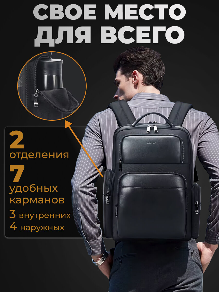 Городской рюкзак Bopai — идеальный выбор для тех, кто ценит комфорт и функциональность в дороге. Благодаря универсальному дизайну аксессуар подойдет как мужчинам, так и женщинам. Внешняя поверхность фронтальных карманов рюкзака для ноутбука Bopai сделана из плотной натуральной кожи. Остальная часть выполнена из износостойкой и прочной ткани. Поверхность материалов влагостойкая, поэтому вещи в рюкзаке останутся сухими даже в дождливую погоду. Чтобы удалить незначительные загрязнения, достаточно воспользоваться влажной салфеткой. Этот рюкзак станет отличным выбором для тех, кто ищет универсальное и стильное решение для повседневной жизни, рабочих и офисных вопросов, путешествий.