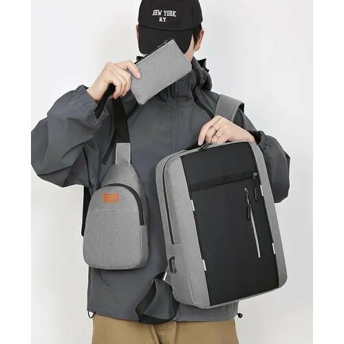 Стильный и функциональный рюкзак – это то, что надо подросткам или взрослым мужчинам. Независимо от возраста и пола, наш рюкзак обязательно станет вашим надежным спутником. Рюкзак городской подойдет для работы или учебы, в него помещается как ноутбук, так и папка формата а4. Также его можно брать с собой в путешествие или поход, так как эта модель имеет несколько карманов и отделений, что позволяет удобно хранить вещи. Главное преимущество мужского рюкзака в том, что он имеет надежные замки, которые сохранят все необходимое в сохранности. Рюкзак серого цвета, выполнен из прочной ткани, имеет красивый фасон и идет в комплекте с барсеткой и кошельком, что делает этот набор отличным вариантом для подарка своим близким. Этот рюкзак также идеально подходит для школы. Стильный дизайн и просторные отделения позволяют удобно разместить все школьные принадлежности.