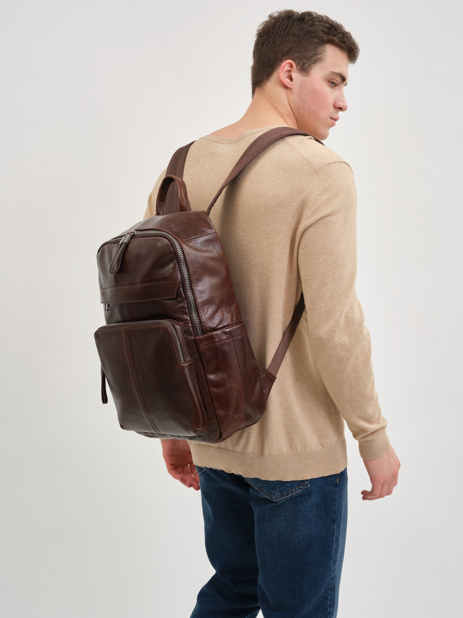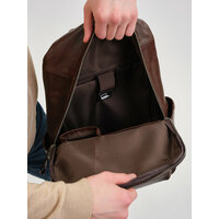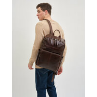Мужской рюкзак в классическом коричневом цвете изготовлен из натуральной кожи высокого качества. Кожа крупного рогатого скота высшего сорта отличается плотностью, упругостью и прочностью.