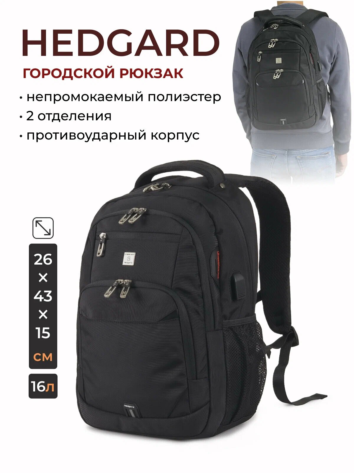 Рюкзак Hedgard 8378-1, с USB-выходом, с отделением для ноутбука, противоударный, мужской, черный: сравнение цен, характеристики, фото, актуальное наличие и цены.