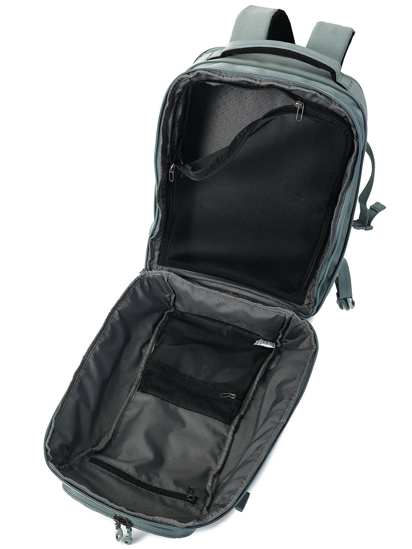 • Анатомическая рельефная спинка с потайным карманом и рукавом для крепления на телескопическую ручку чемодана