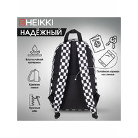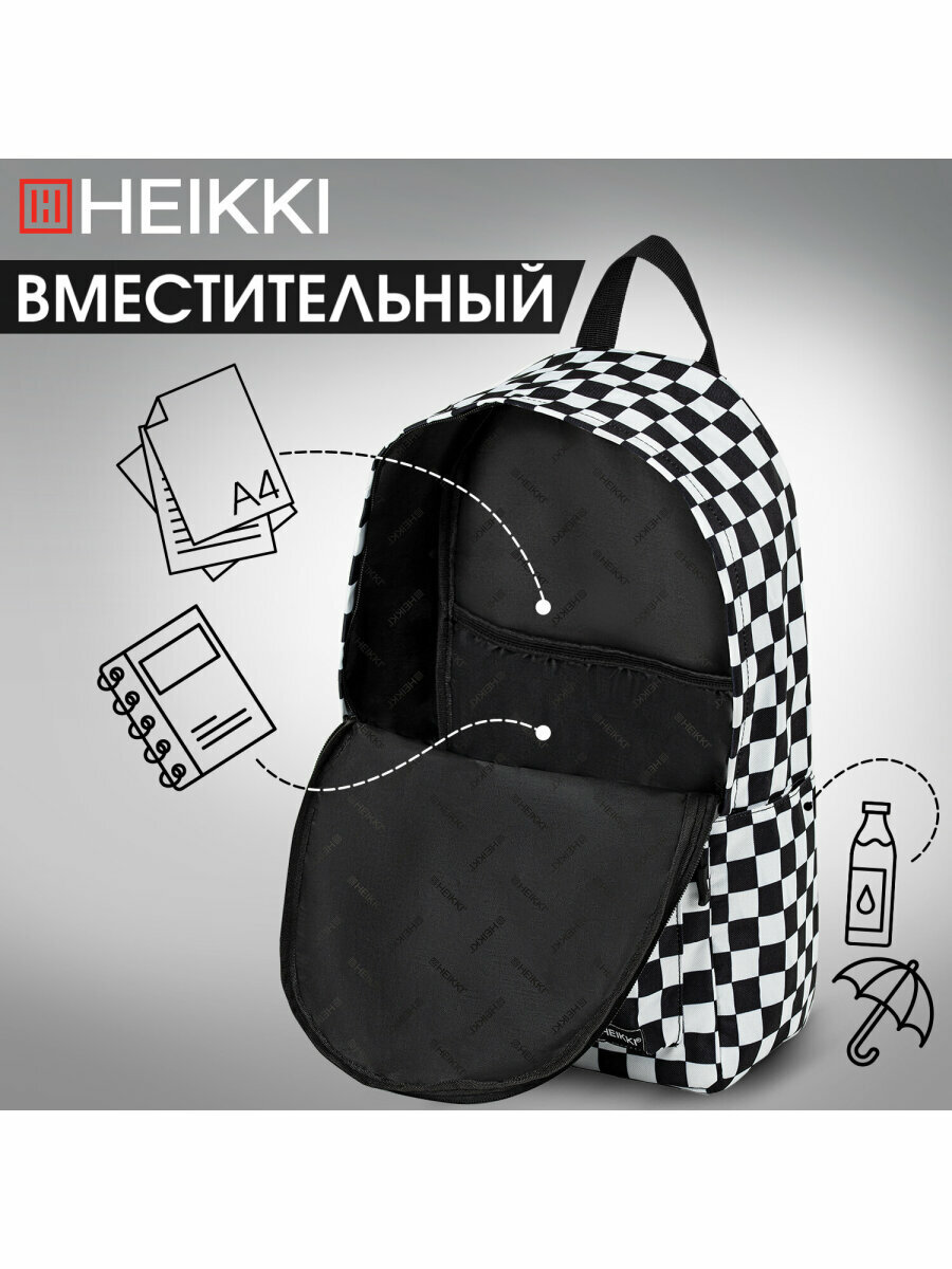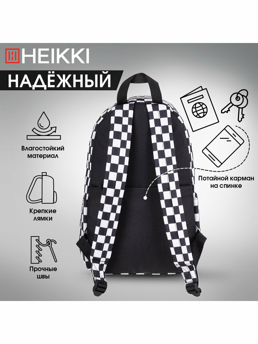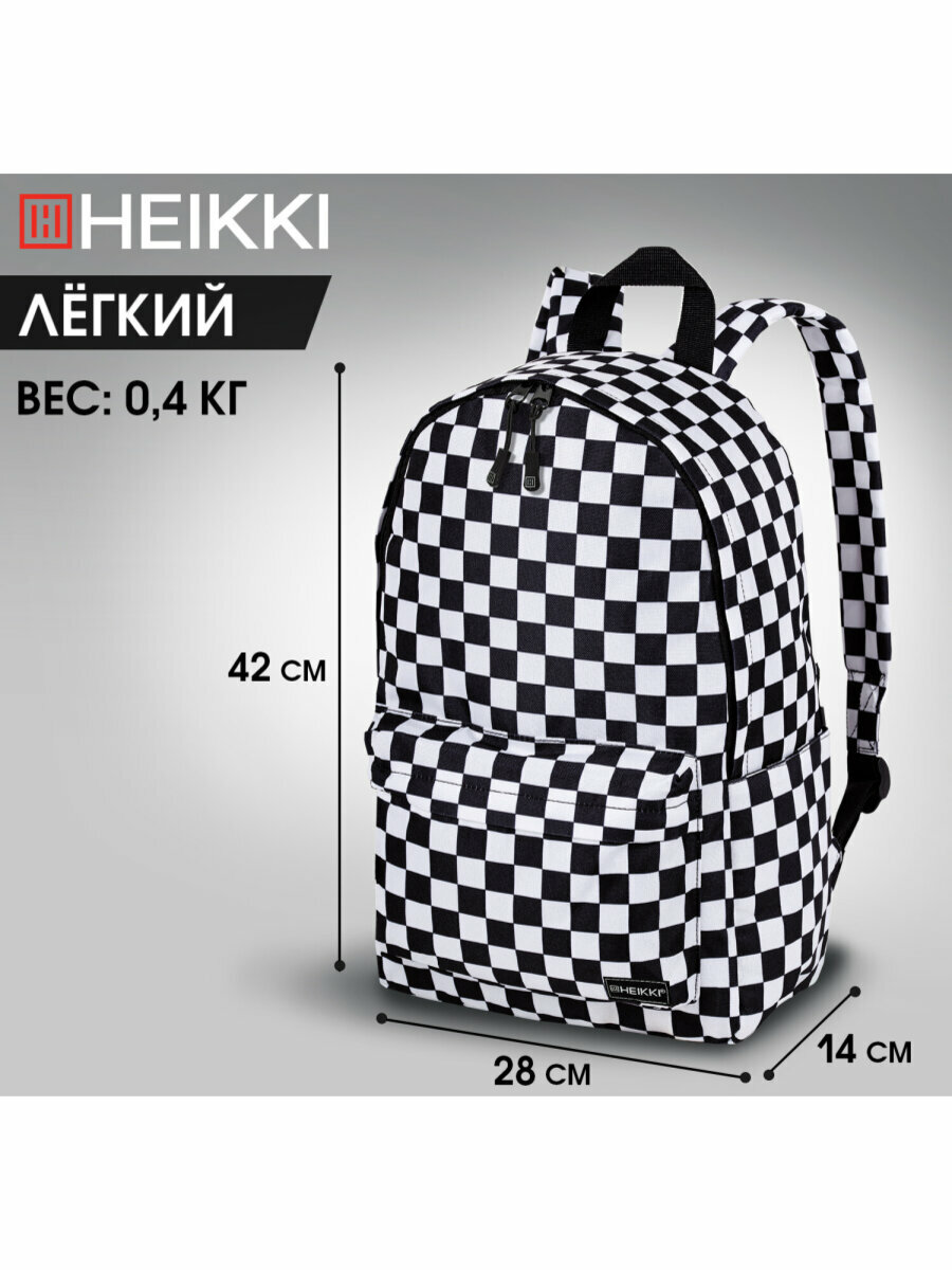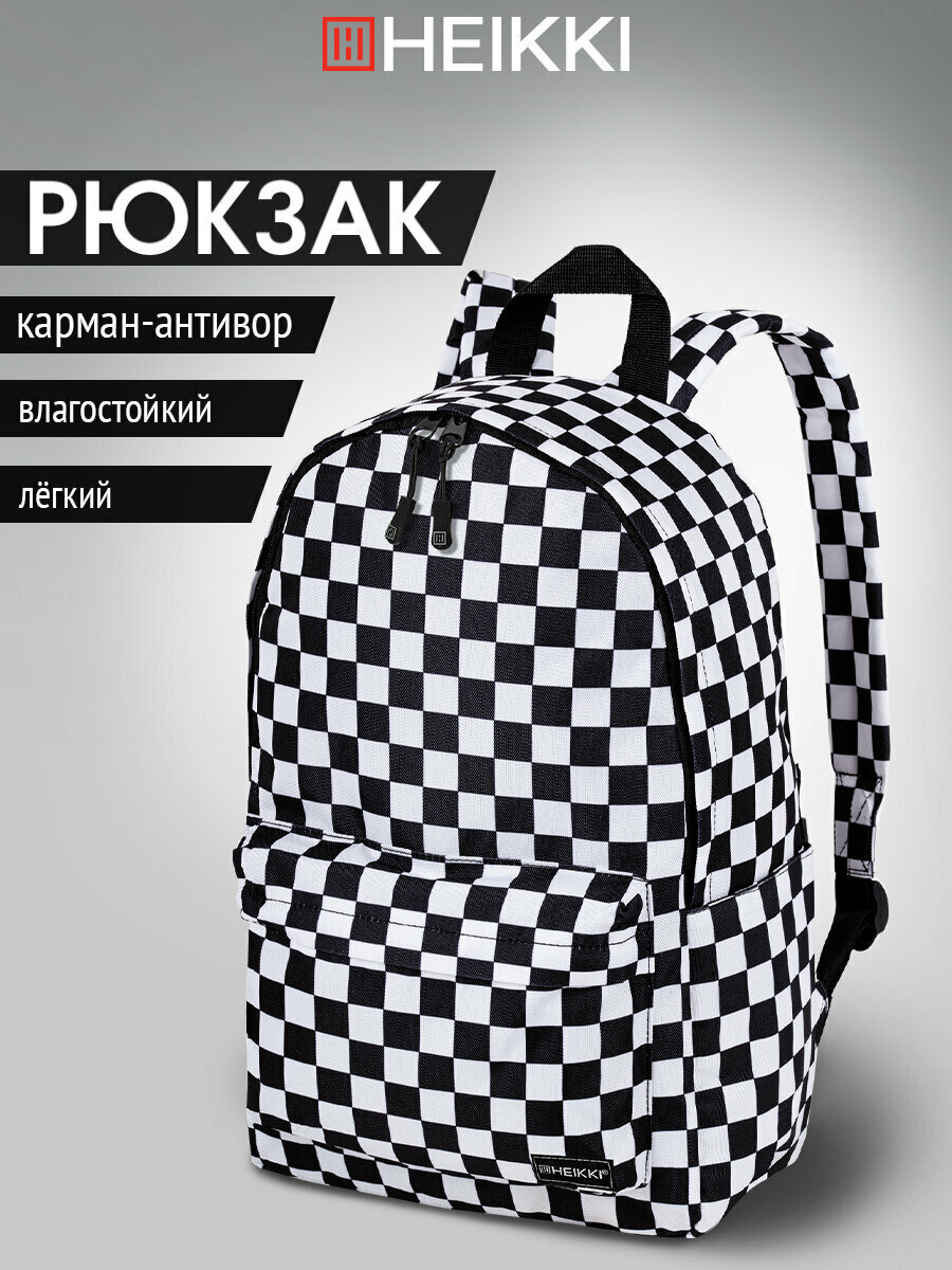 Рюкзак HEIKKI POSITIVE (хейки) универсальный, черно-белый, размером 42х28х14 см, это идеальное сочетание стиля и функциональности. Этот рюкзак женский и рюкзак мужской одновременно – благодаря лаконичному дизайну и универсальному принту в виде черно-белой клетки. Его можно использовать как рюкзак школьный для девочек и мальчиков, что делает его отличным выбором для учебы, прогулок и путешествий.