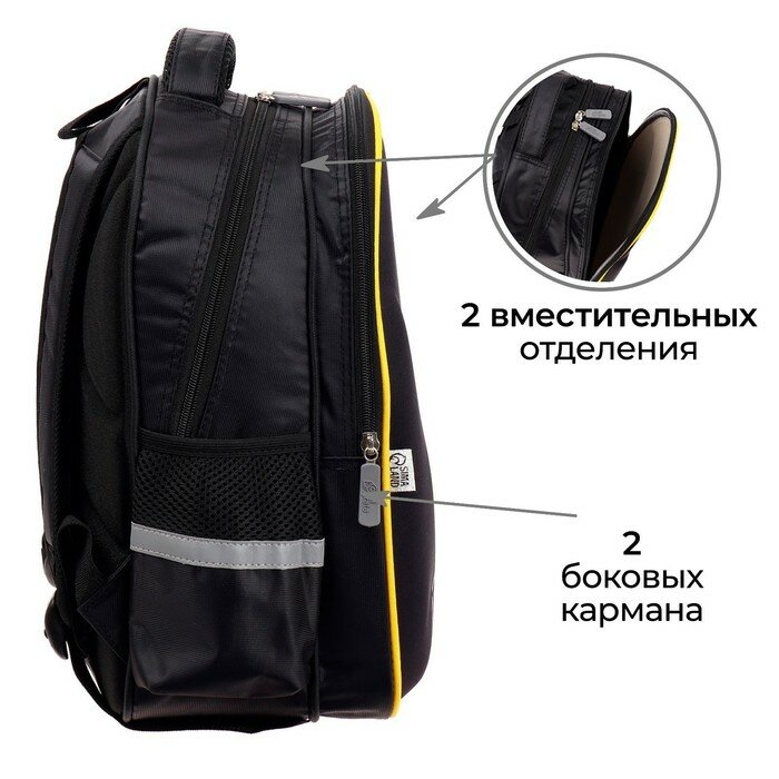 Школьный рюкзак каркасный с эргономичной спинкой, жёсткой спинкой и светоотражающими элементами. Вместительный, с двумя отделениями, карманом на боковой стороне и сетчатым карманом спереди. Подходит под формат А4.