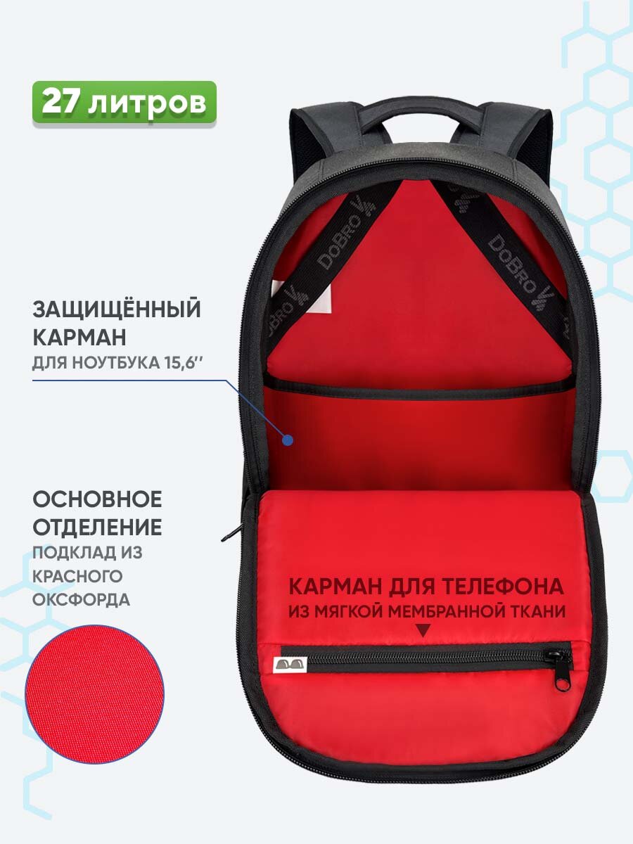 Влагостойкая ткань, износостойкая ткань, усиленные швы, мягкая вставка, карман для очков и телефона, карман анти-вор на спинке. Удобные внешние и внутренние боковые карманы.