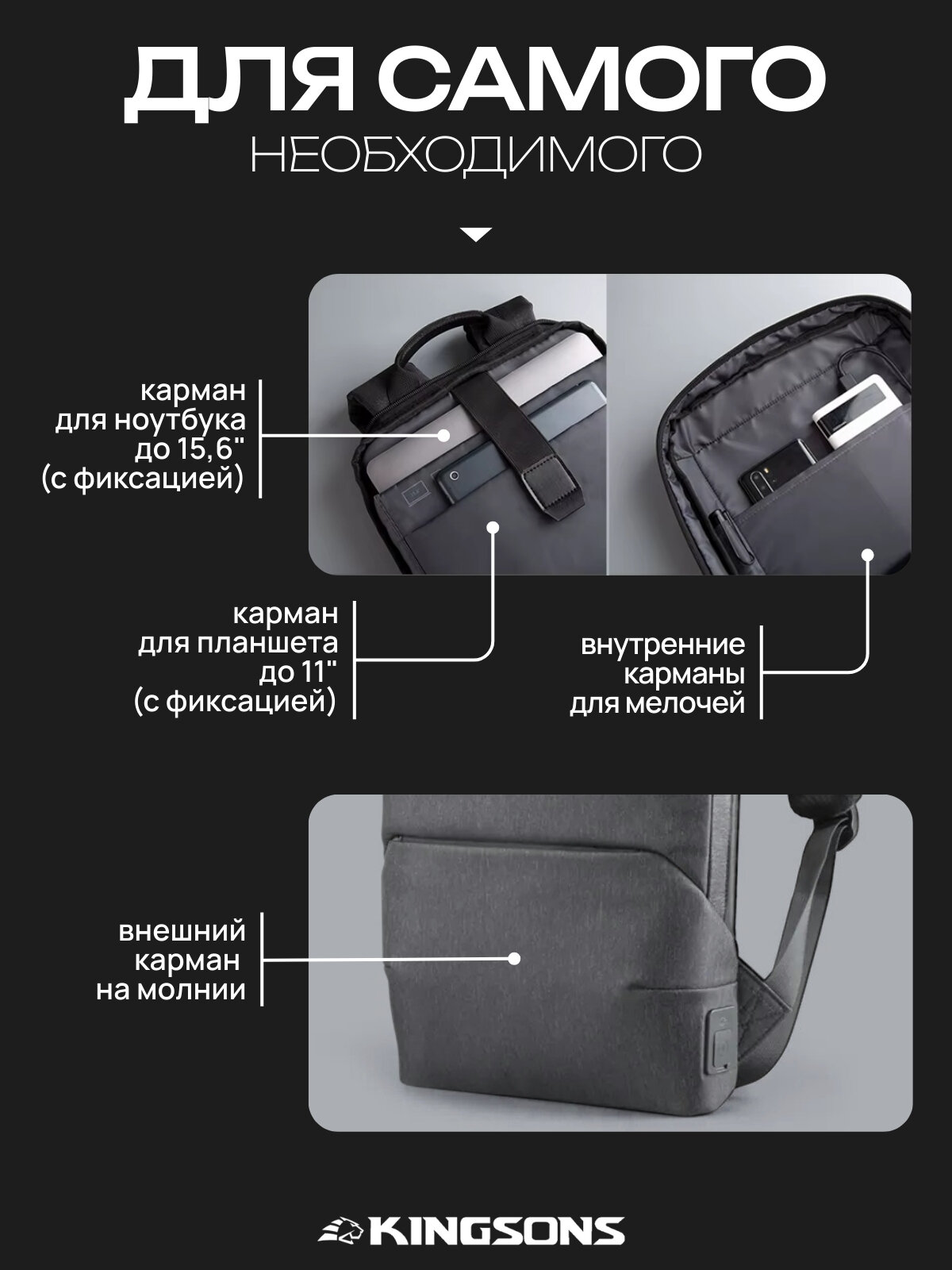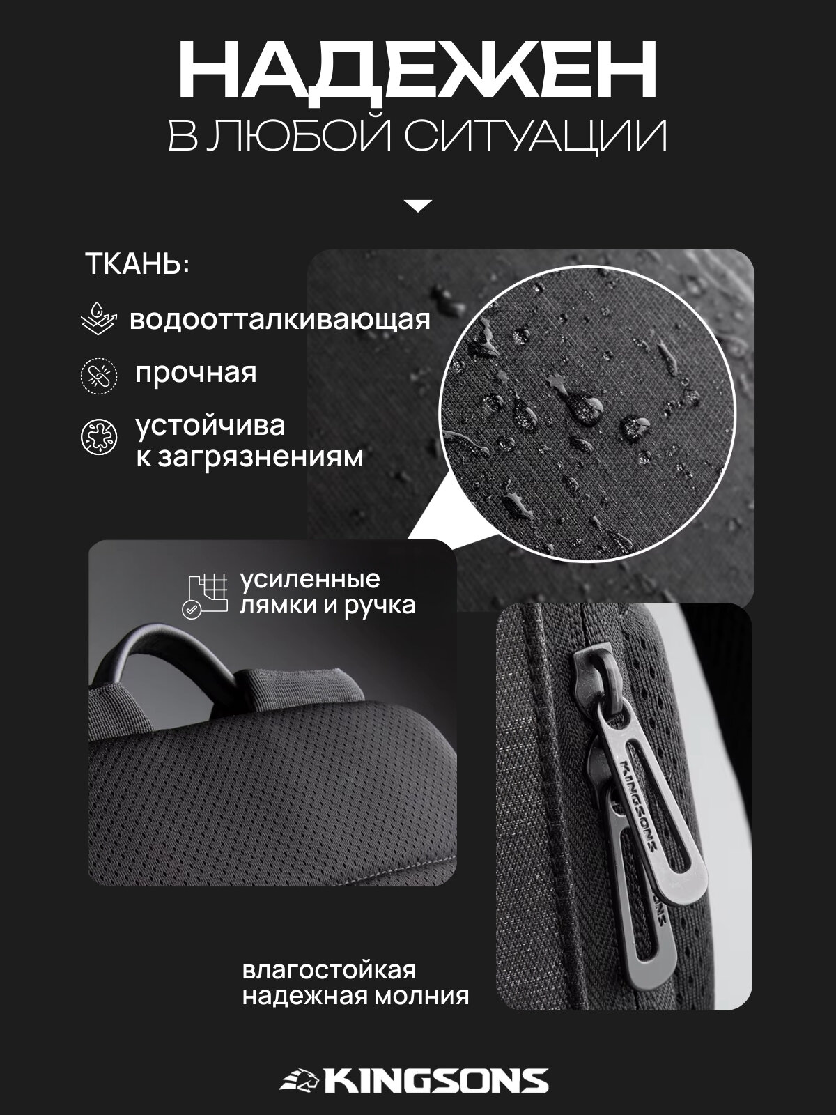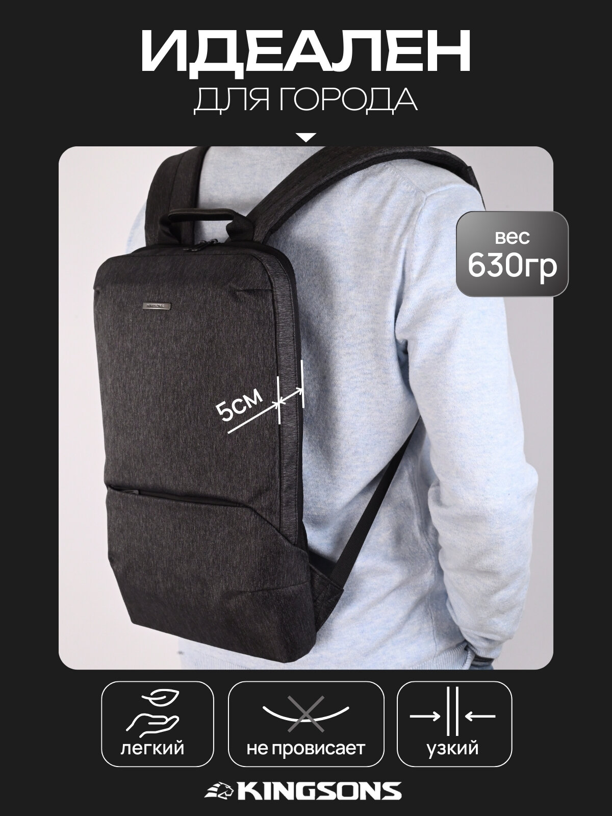 Ультратонкий рюкзак Kingsons сшит из износостойкого полиэстера, практически не подверженного мелким механическим повреждениям и истиранию волокон. Кроме того, это водоотталкивающий материал: влага собирается на поверхности каплями и просто стекает с ткани, а не впитывается. Небольшой дождь не намочит ваши вещи и ноутбук.