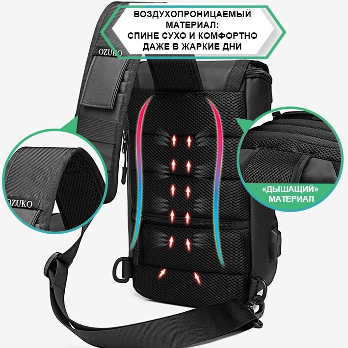 Купить Рюкзак мужской городской на одно плечо Ozuko маленький 7л, для планшета 9.7″, непромокаемый, с USB зарядкой, взрослый/подростковый, цвет черный с доставкой по всей России.