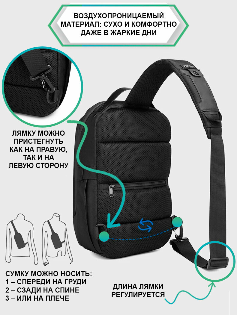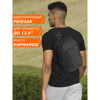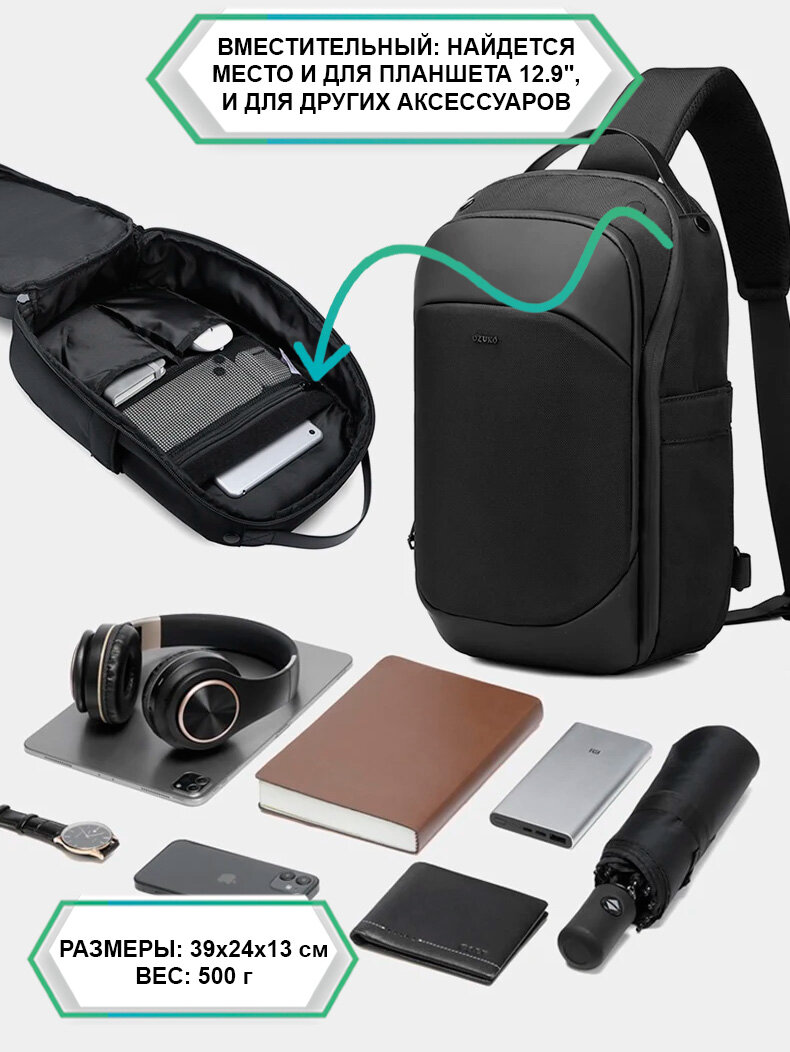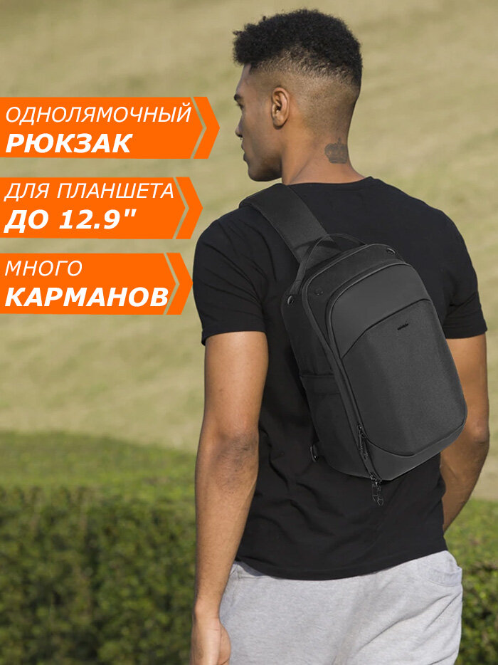 Купить Рюкзак мужской городской однолямочный через плечо Ozuko универсальный 12л, для планшета 12.9″, водонепроницаемый, черный с доставкой по всей России.